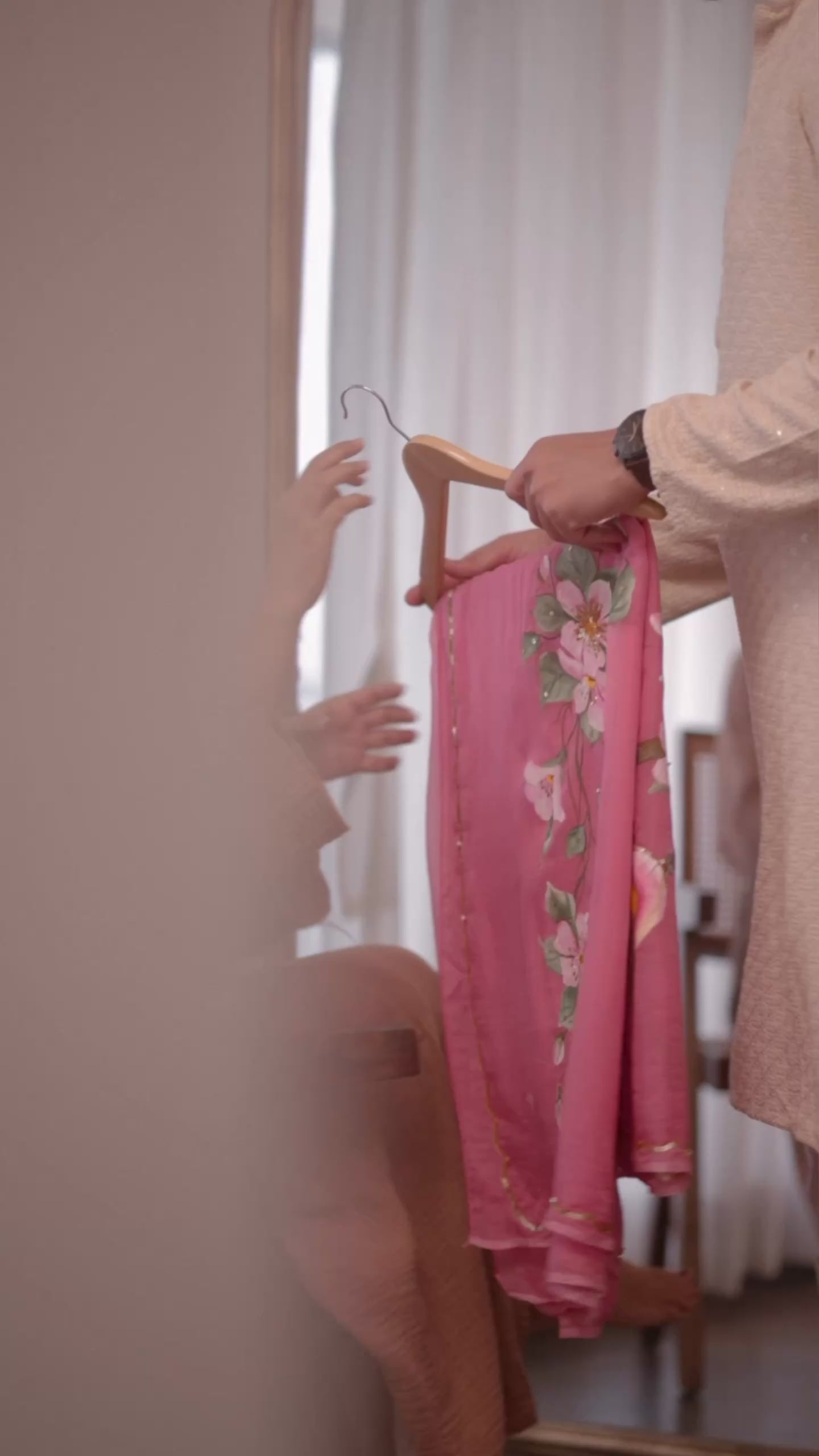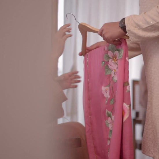 Where tradition meets artistry — this Signature Pink Organza Silk Saree tells a story of flowers, beloved, and eternal companionship. Crafted on ethereal pink organza, this heirloom piece celebrates romance, artistry and timeless elegance.