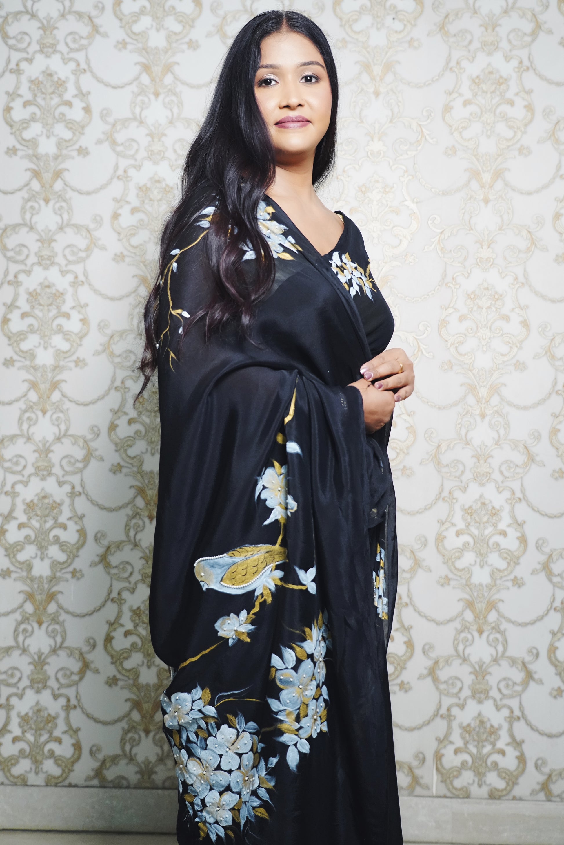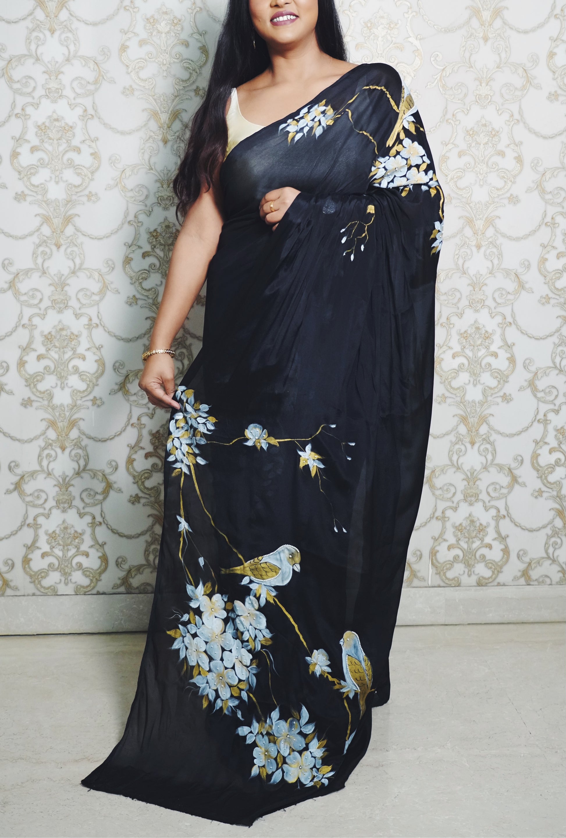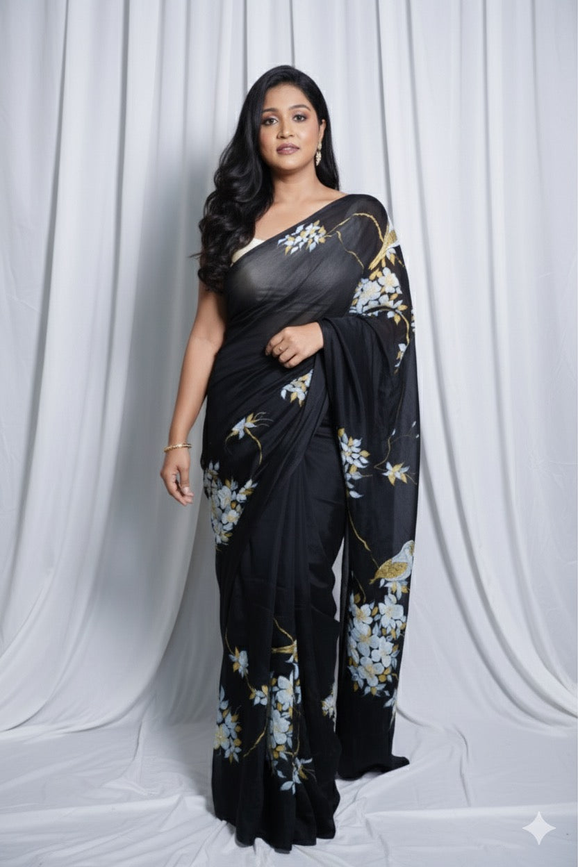 A gentle flight through nature’s poetry — this exquisite chiffon silk saree is hand-painted with blooming florals and dainty birds, set against a luxurious black canvas.