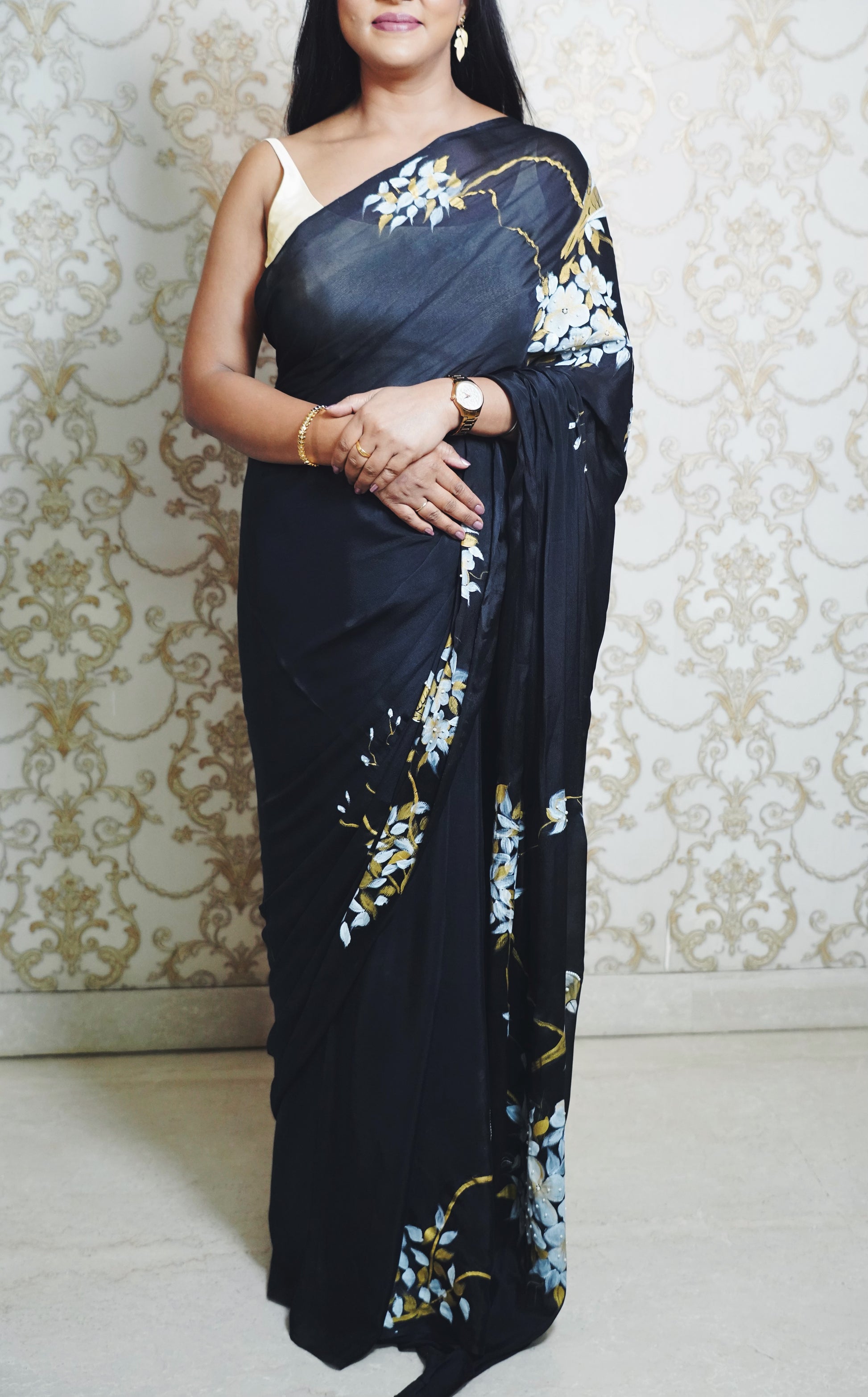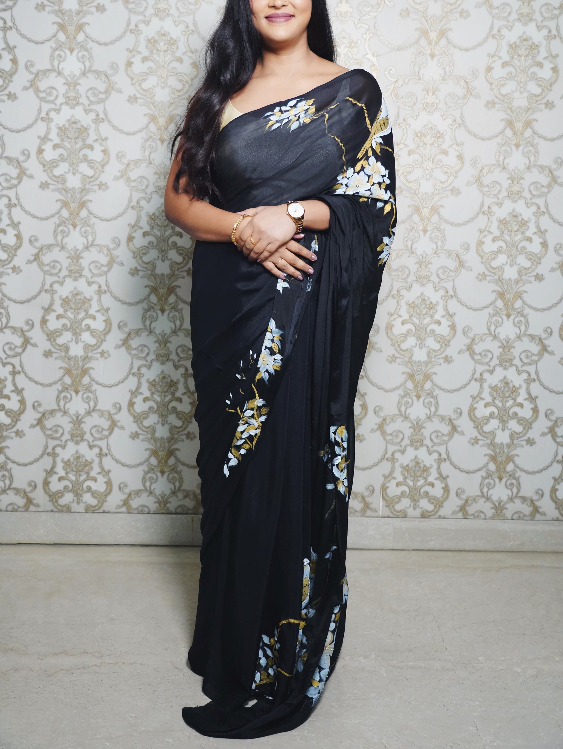 Each element is thoughtfully painted by hand, capturing the charm of garden moments — fluttering wings, fragrant blossoms, and quiet elegance. The sheer texture of chiffon silk adds an ethereal dimension, making this saree ideal for wedding festivities, intimate celebrations, or cocktail parties.