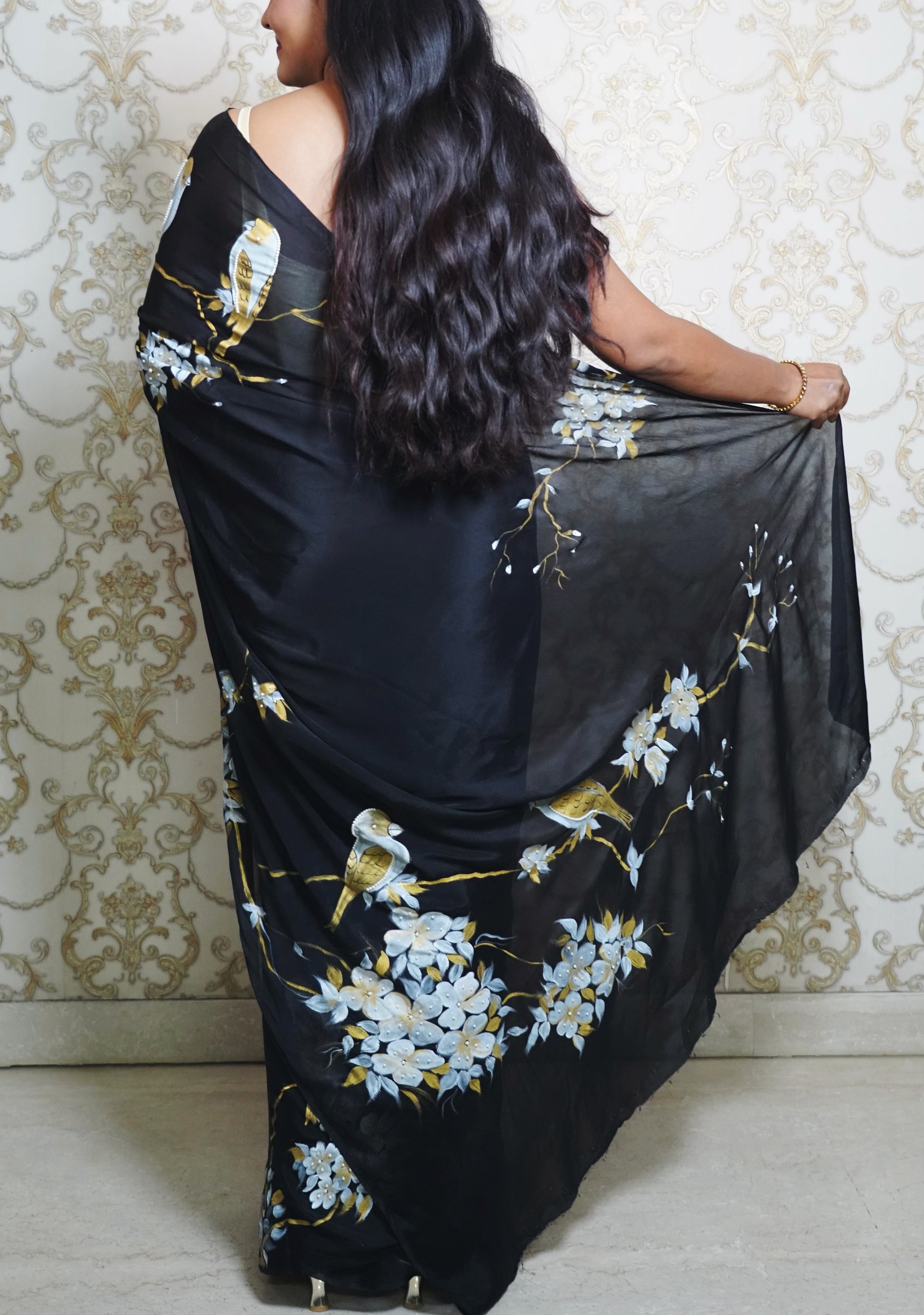 This saree carries time, intention and technique, Total Hours: 50.Hand-Painted Signature Birds and Floral Black Saree With Delicate Pearl Work