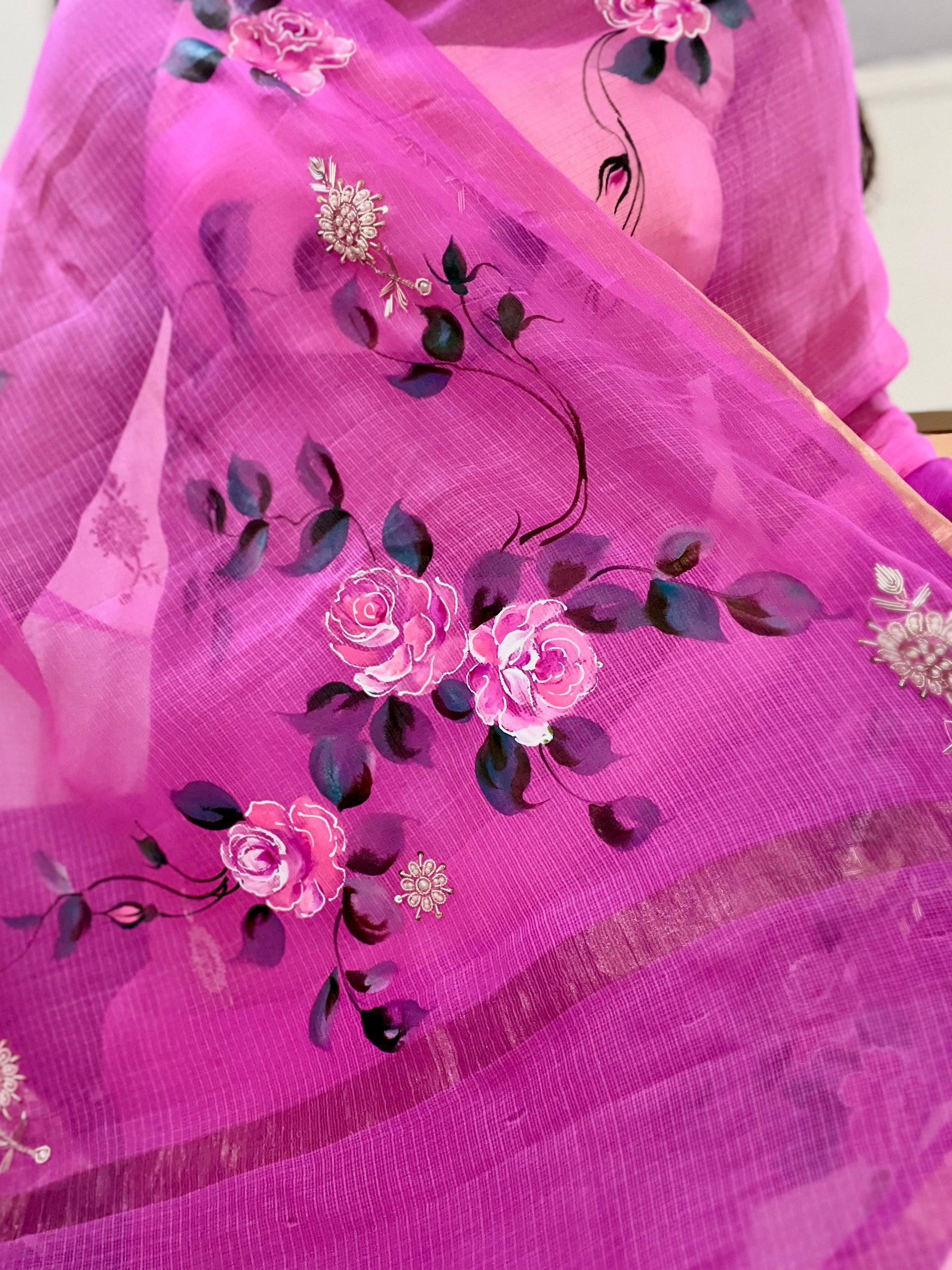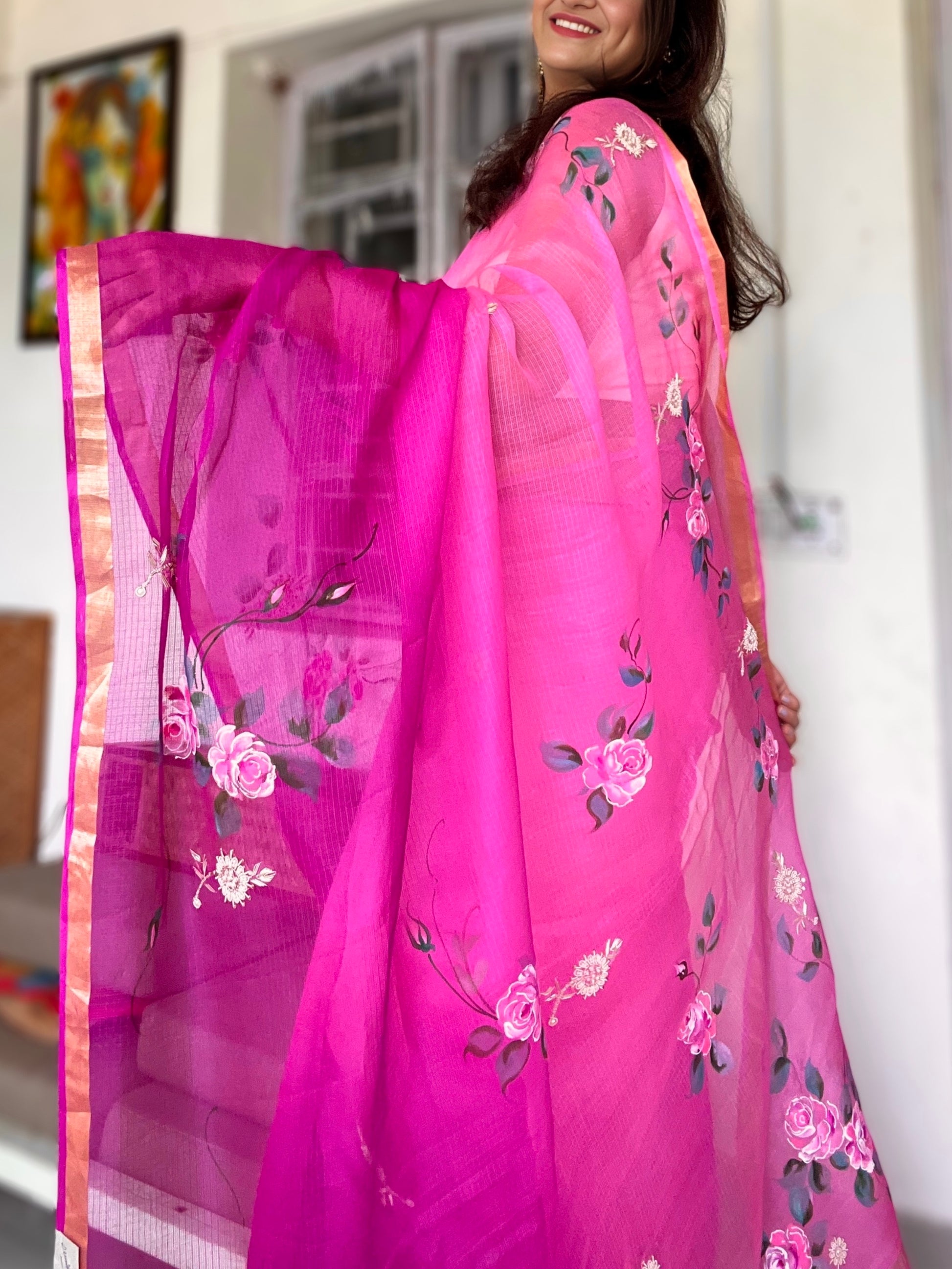 Roses Handpainted Double Tone Kota Silk Saree With Hand Embroidery