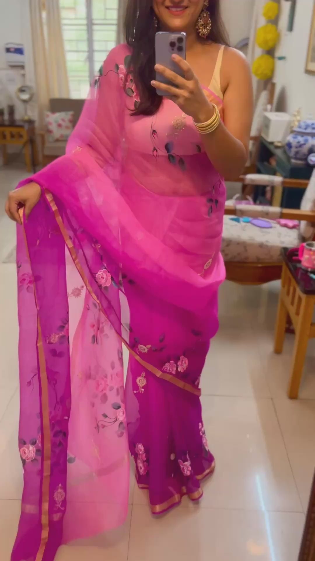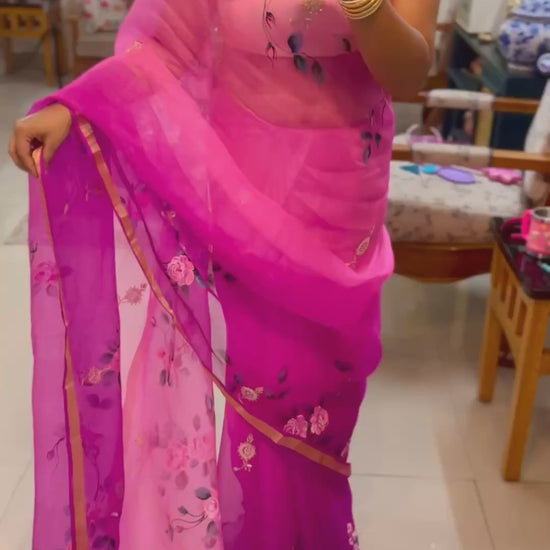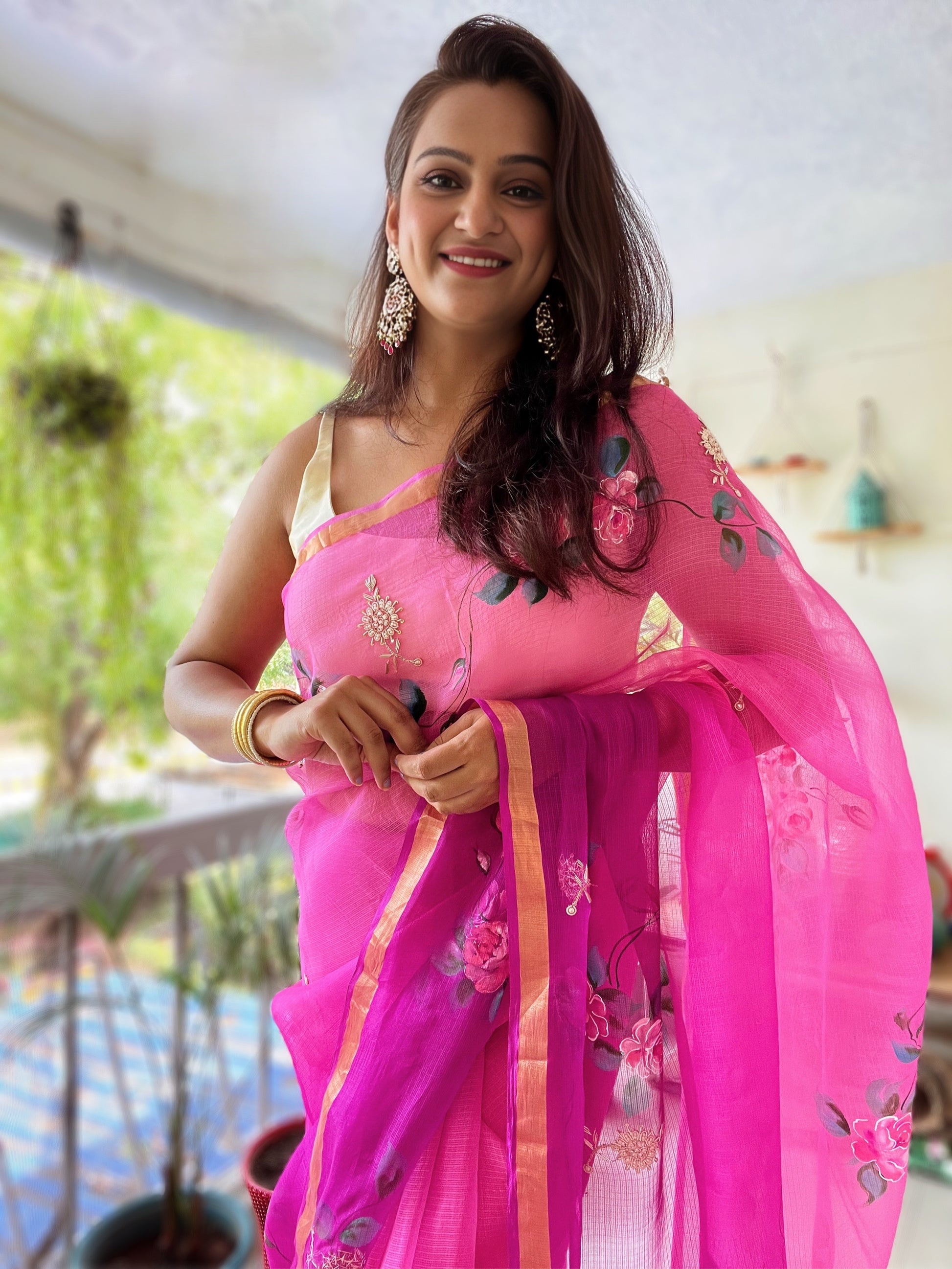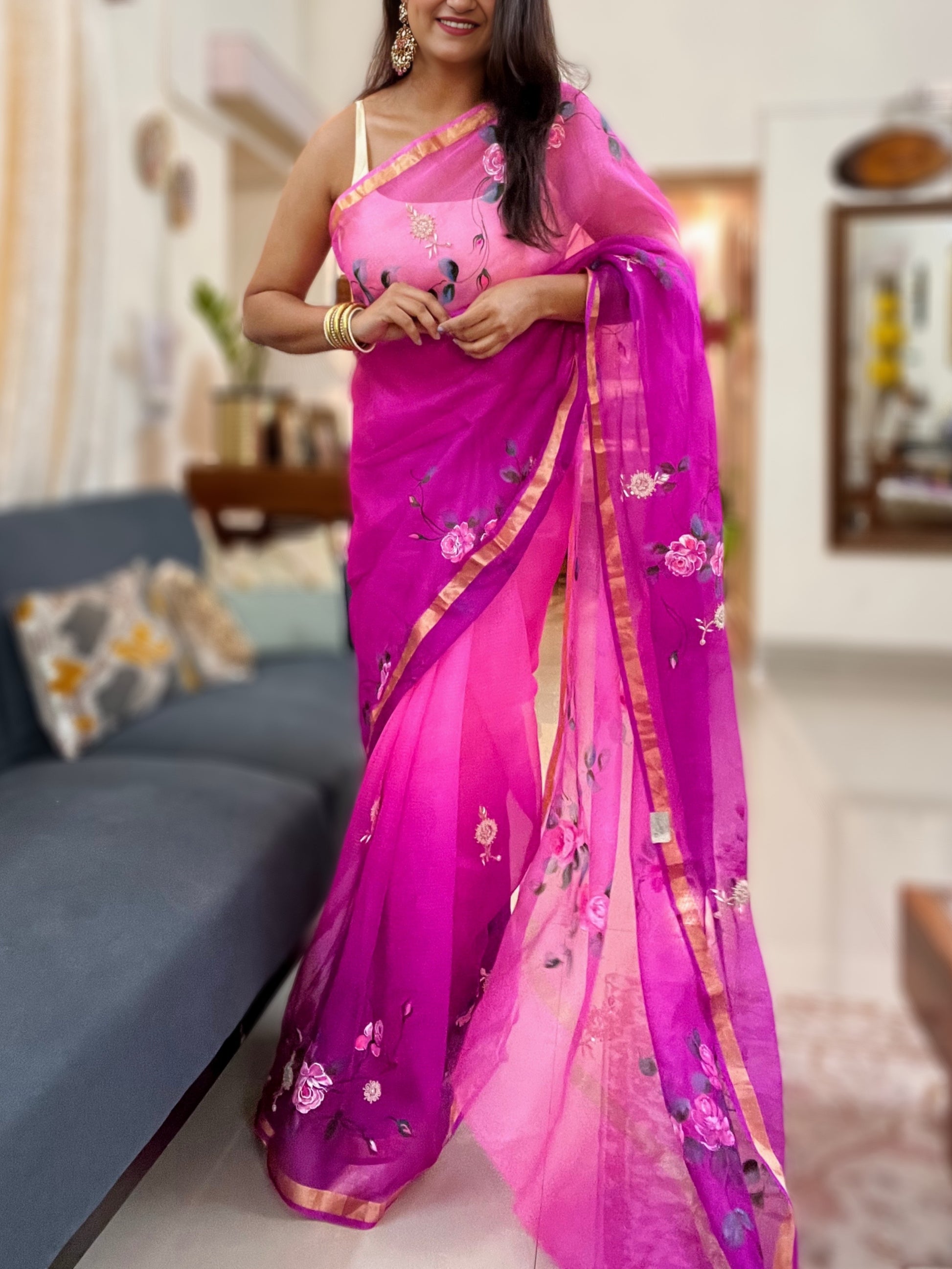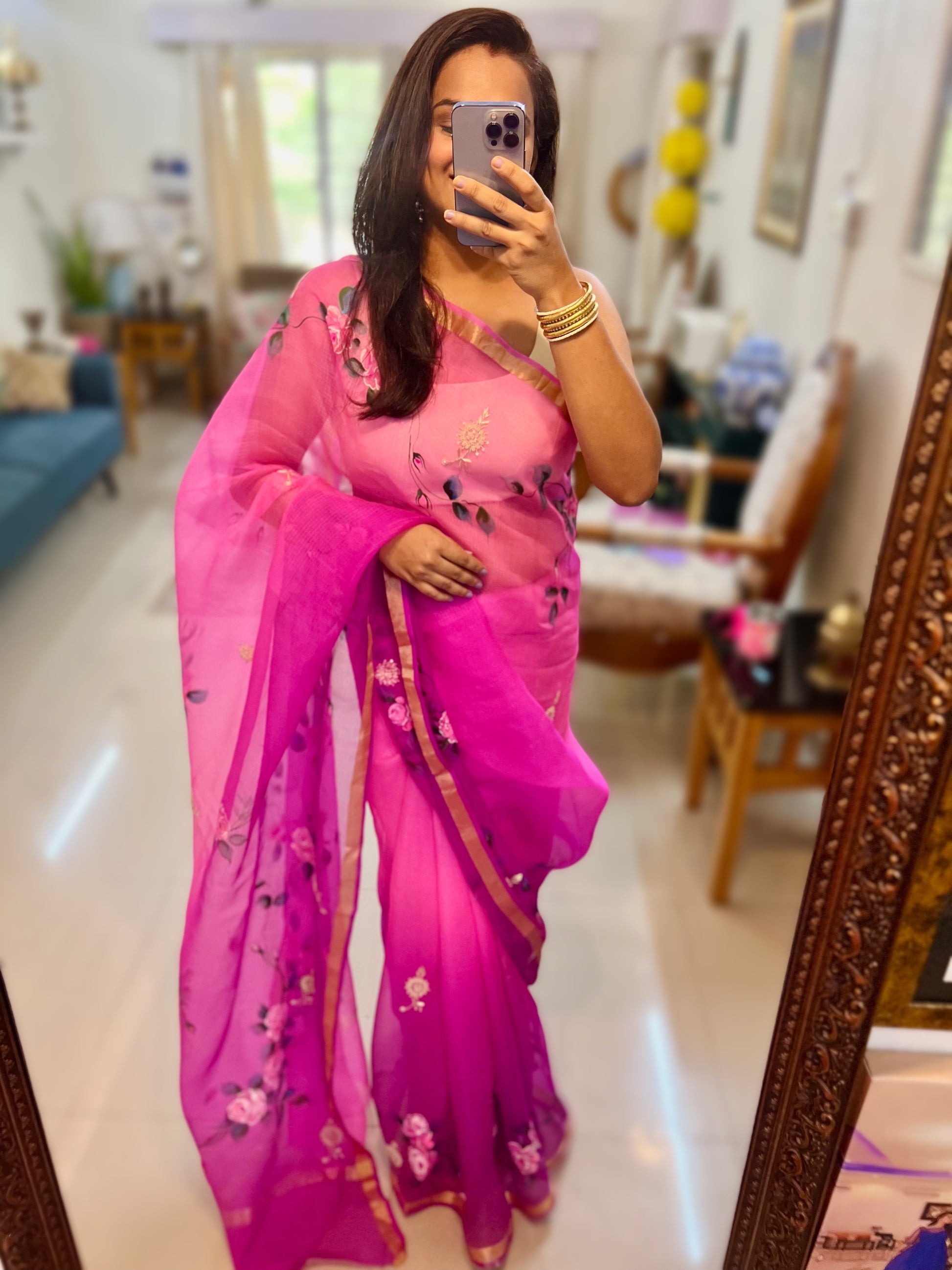 A delicate riot of roses this twin shaded saree in shades of pink and purple in pure kota silk comes with hand painted roses all over. A true celebration of hand-crafted elegance. Adorned with vibrant blooms, the saree is further elevated with pearl, zardosi embroidery, adding a hint of shimmer in its breezy silhouette.
