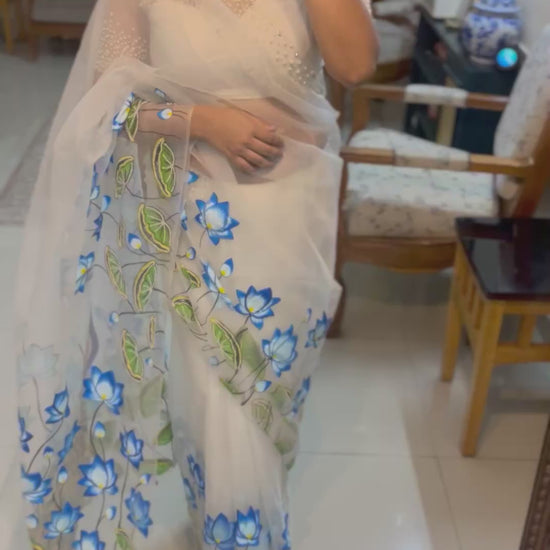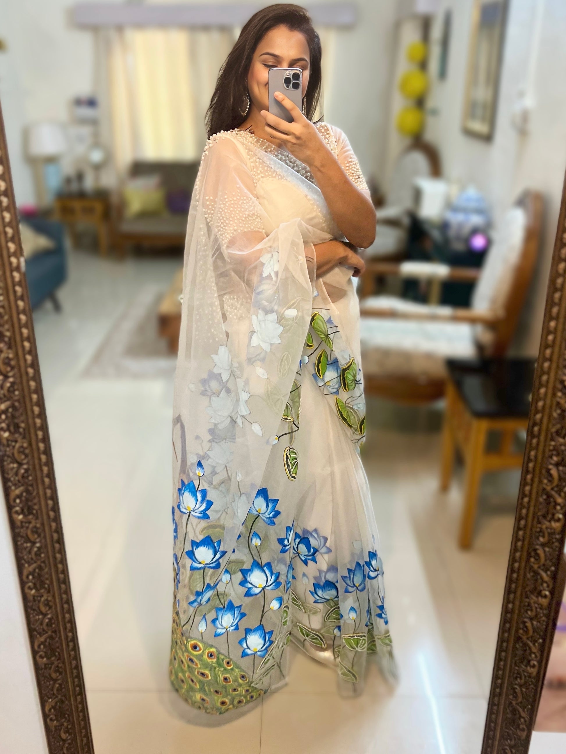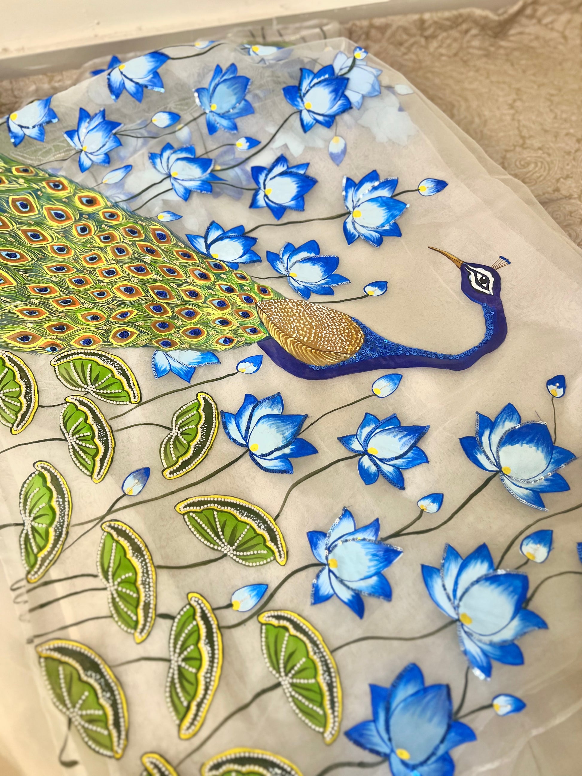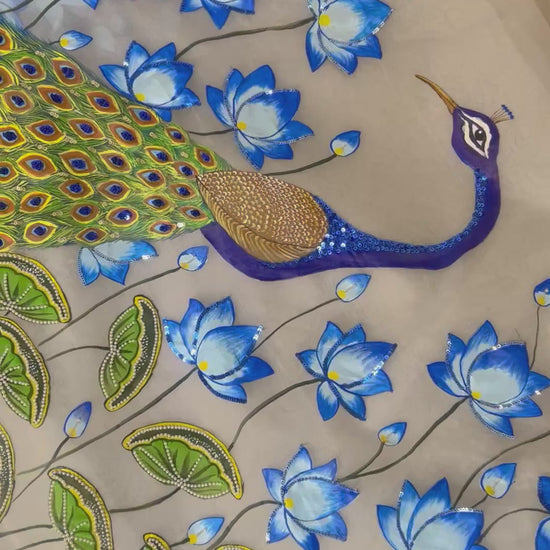 Hand-Painted Pichwai Blue Lotus & Peacock Saree With Pearl and stone embroidery