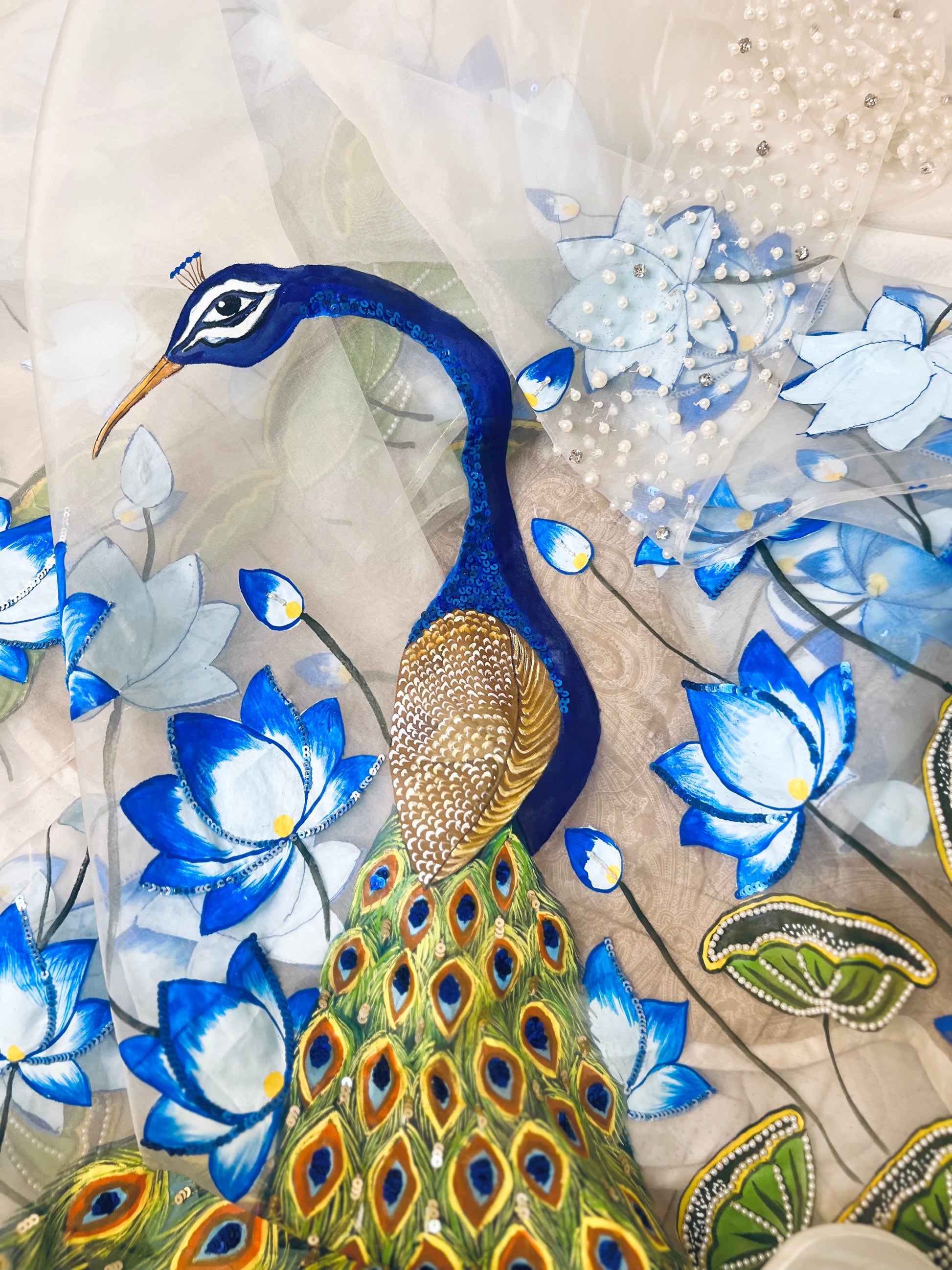 The pallu unveils a stunning hand-painted peacock poised in all its regal glory—an eternal symbol of grace, devotion, and celebration. Adding a touch of shimmer, the saree is intricately adorned with hand embroidery in pearl, sitara and stone embroidery all over, catching the light with every movement.