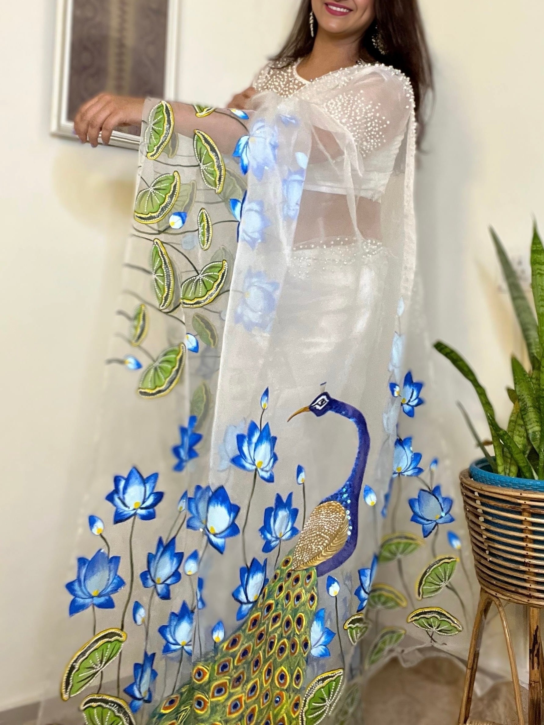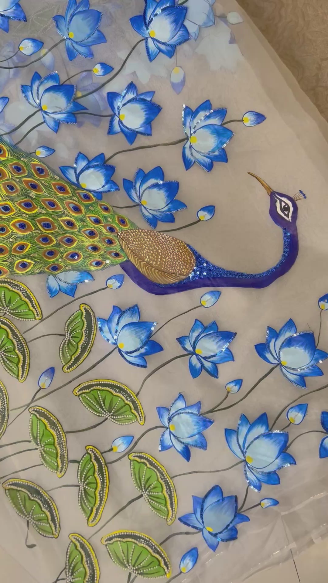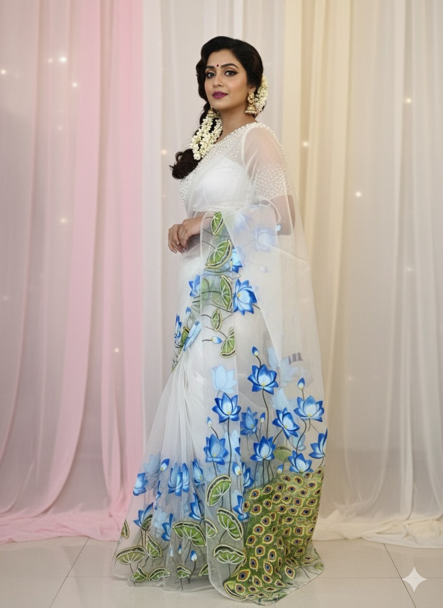 • Technique: Hand-painted Pichwai blue lotuses with a peacock motif on pallu