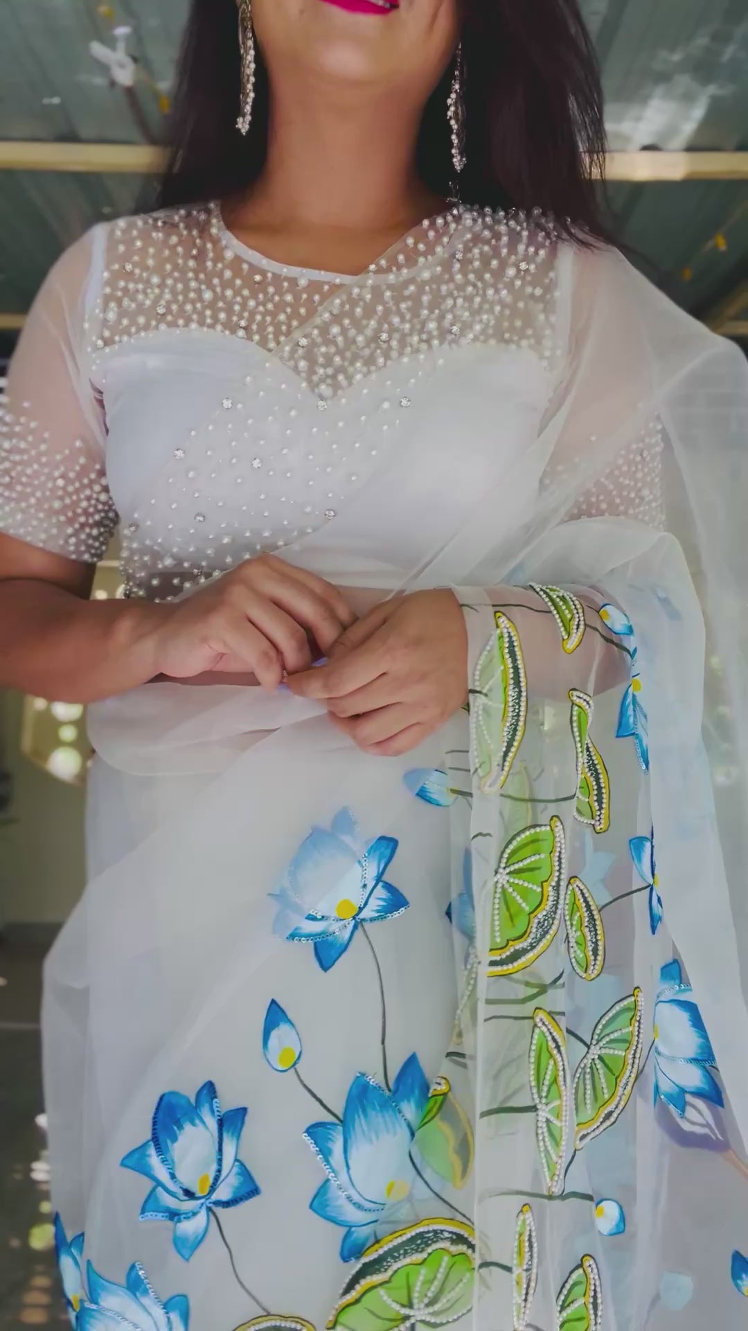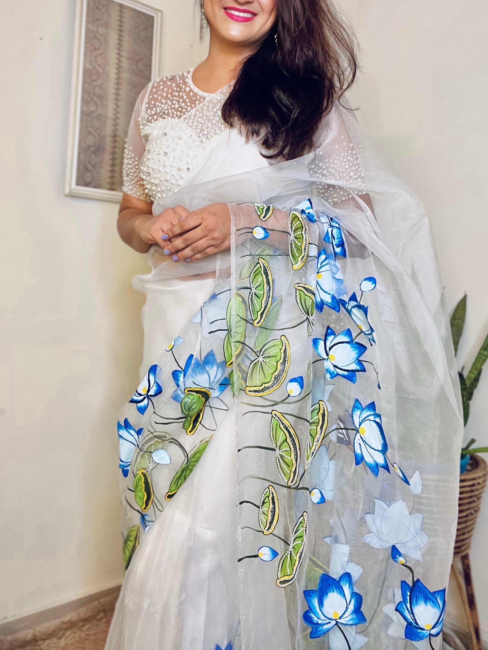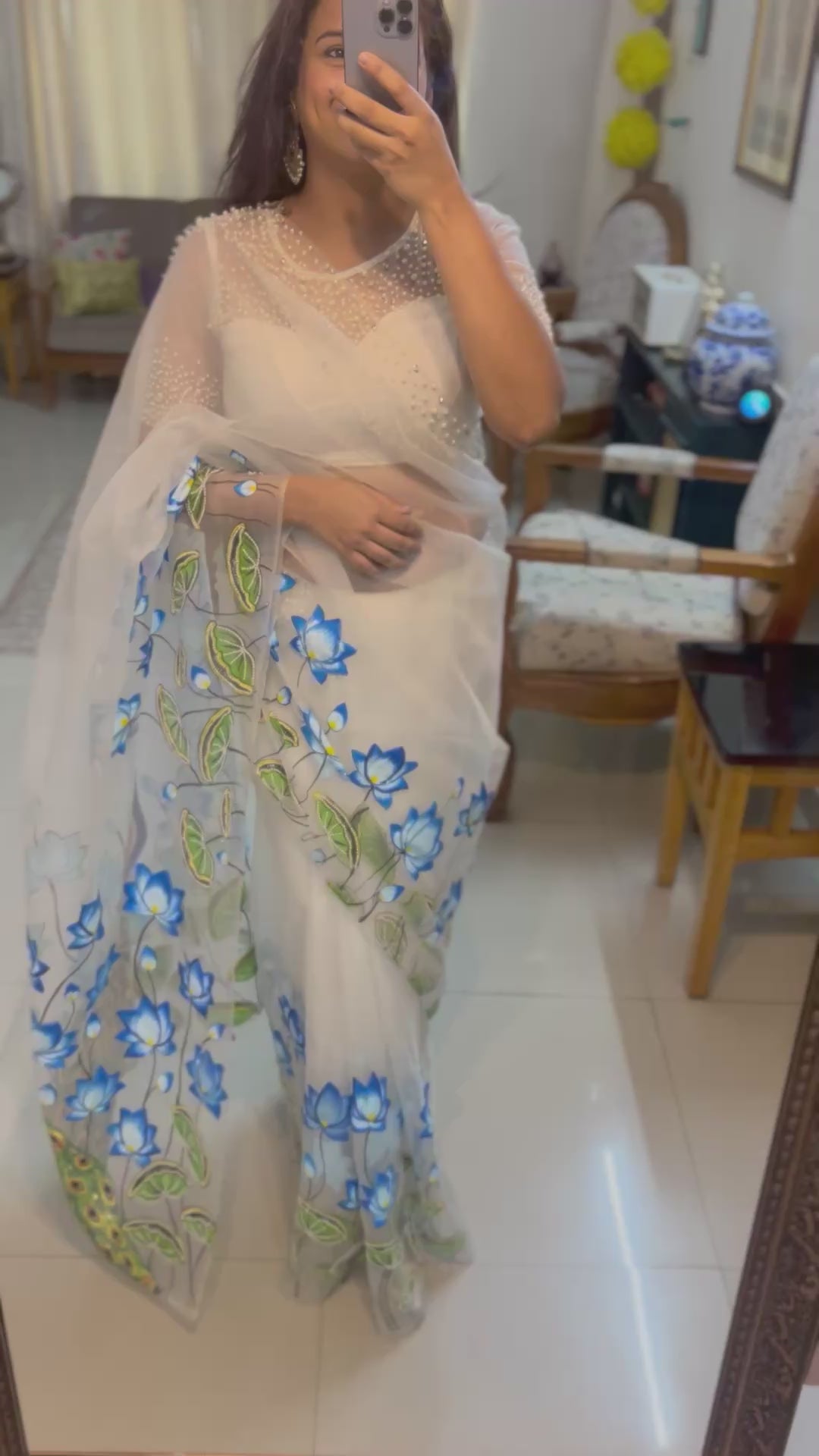 • Technique: Hand-painted Pichwai blue lotuses with a peacock motif on pallu
