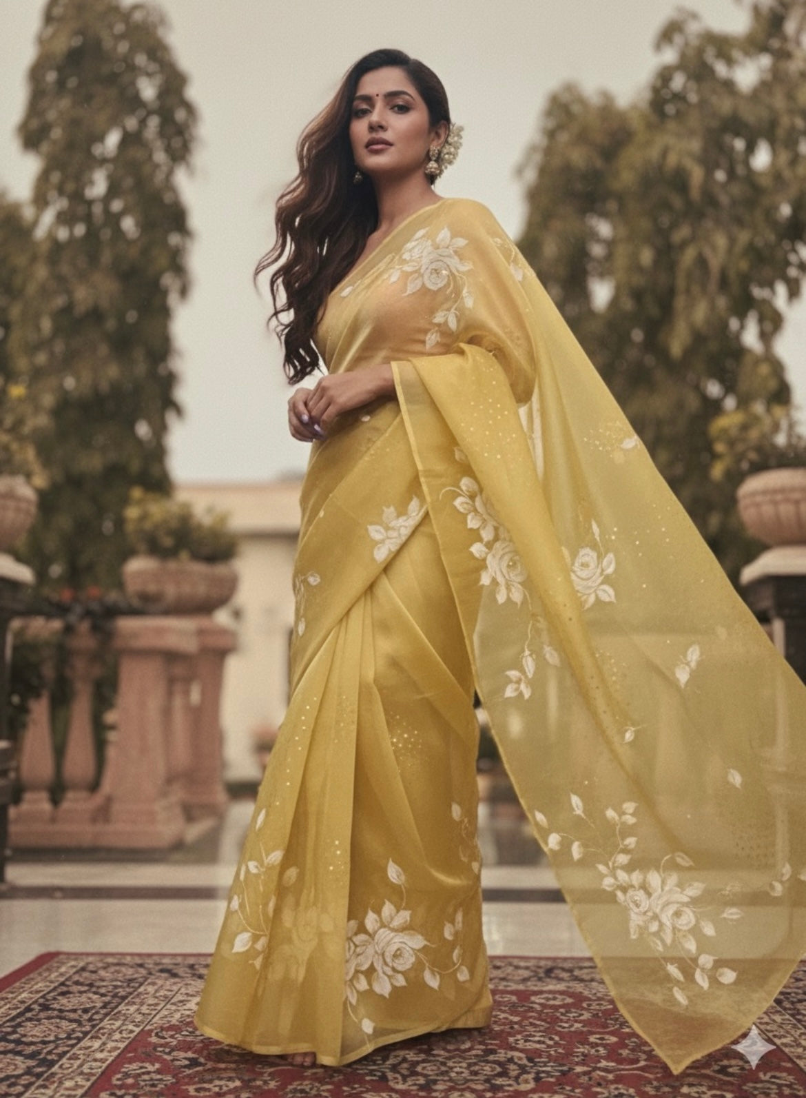 A celebration of quiet opulence, this mustard tissue organza saree is hand-painted with delicate roses in soft white and antique gold—each bloom a whisper of timeless grace.