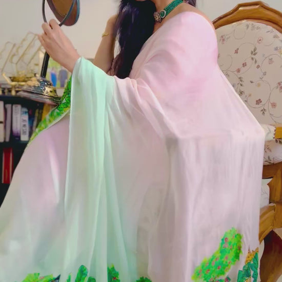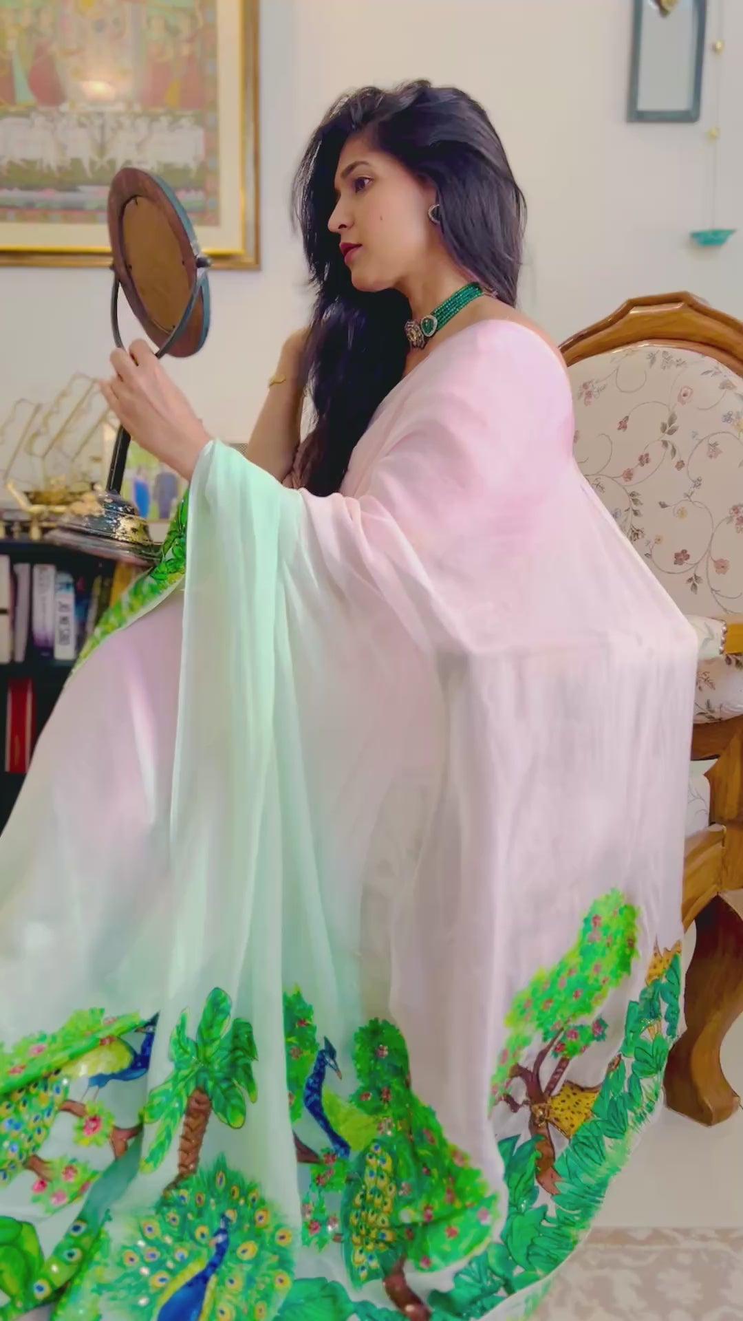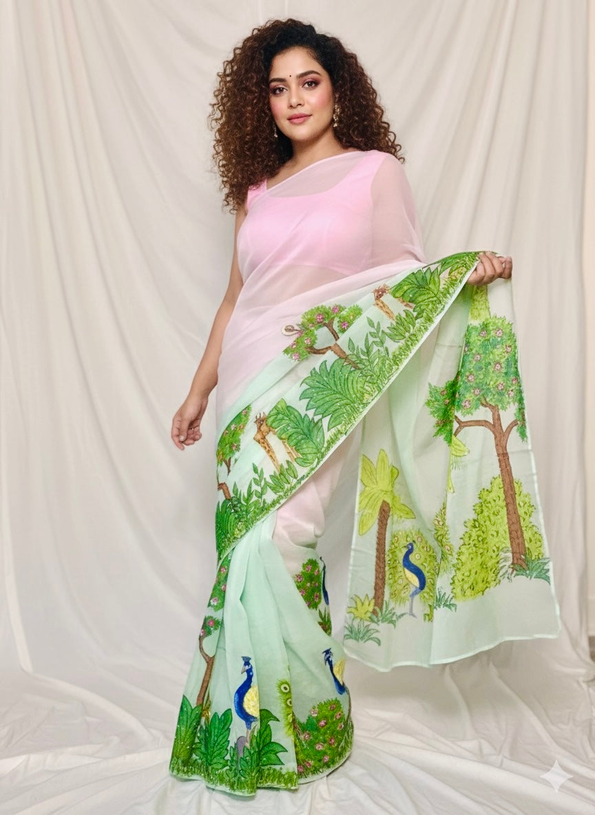 This one-of-a kind saree that makes you step into the divine wilderness of Vrindavan is intricately hand-painted Pichwai saree, a soulful tribute to the sacred forests where art, nature, and mythology entwine. Crafted on luminous organza silk in a dreamy dual-tone of mint and blush pink, the saree captures the enchanting beauty of Vrindavan’s flora and fauna.
