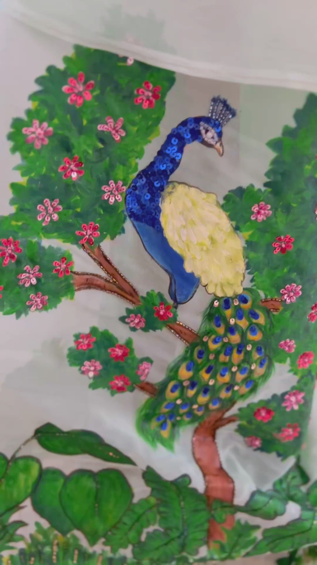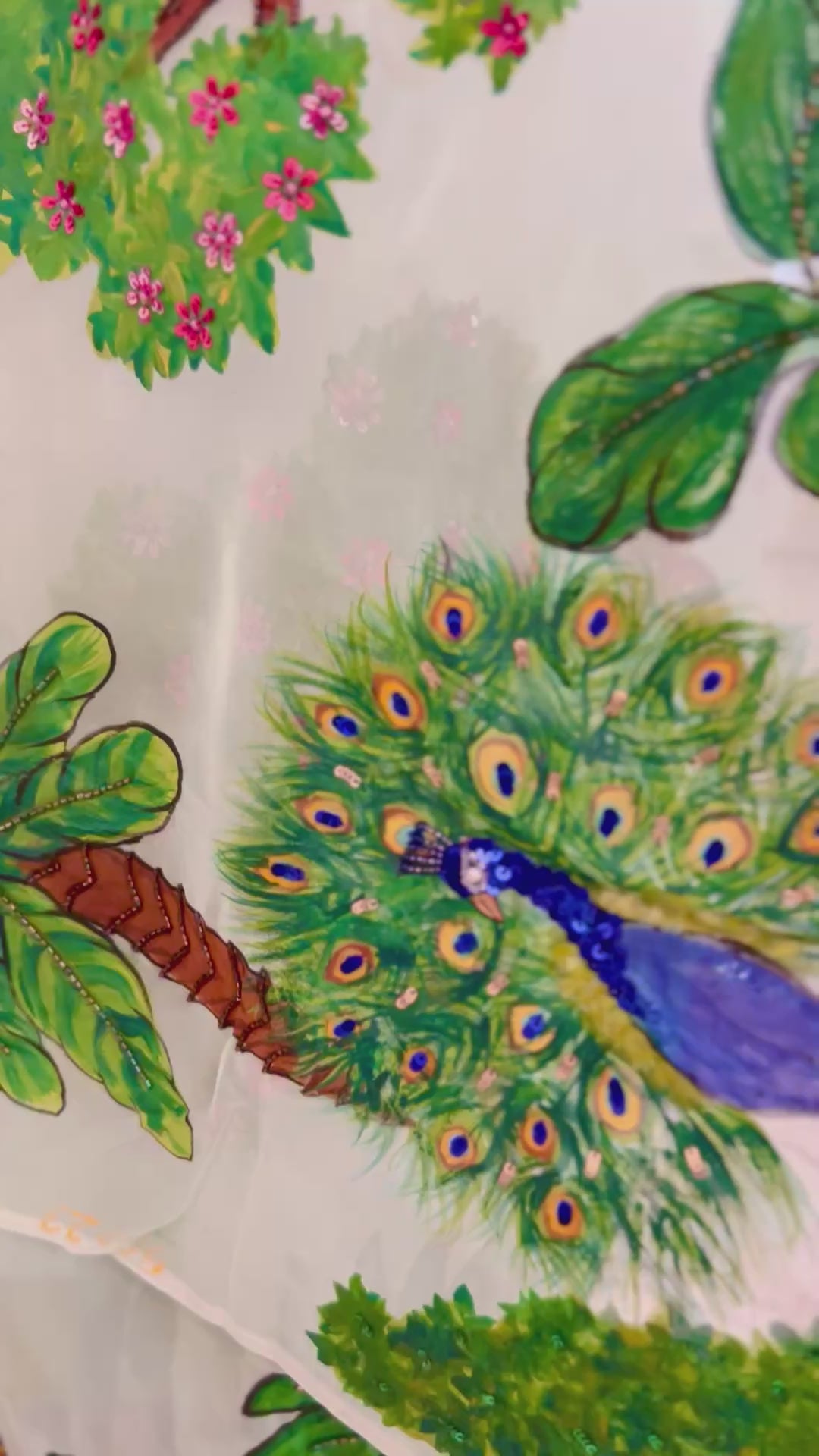 Every inch of the drape tells a story — from delicate flowers and wild creepers to peacocks and animals, each element is hand-painted with exquisite detail, transforming the saree into a moving canvas of devotion and artistry.