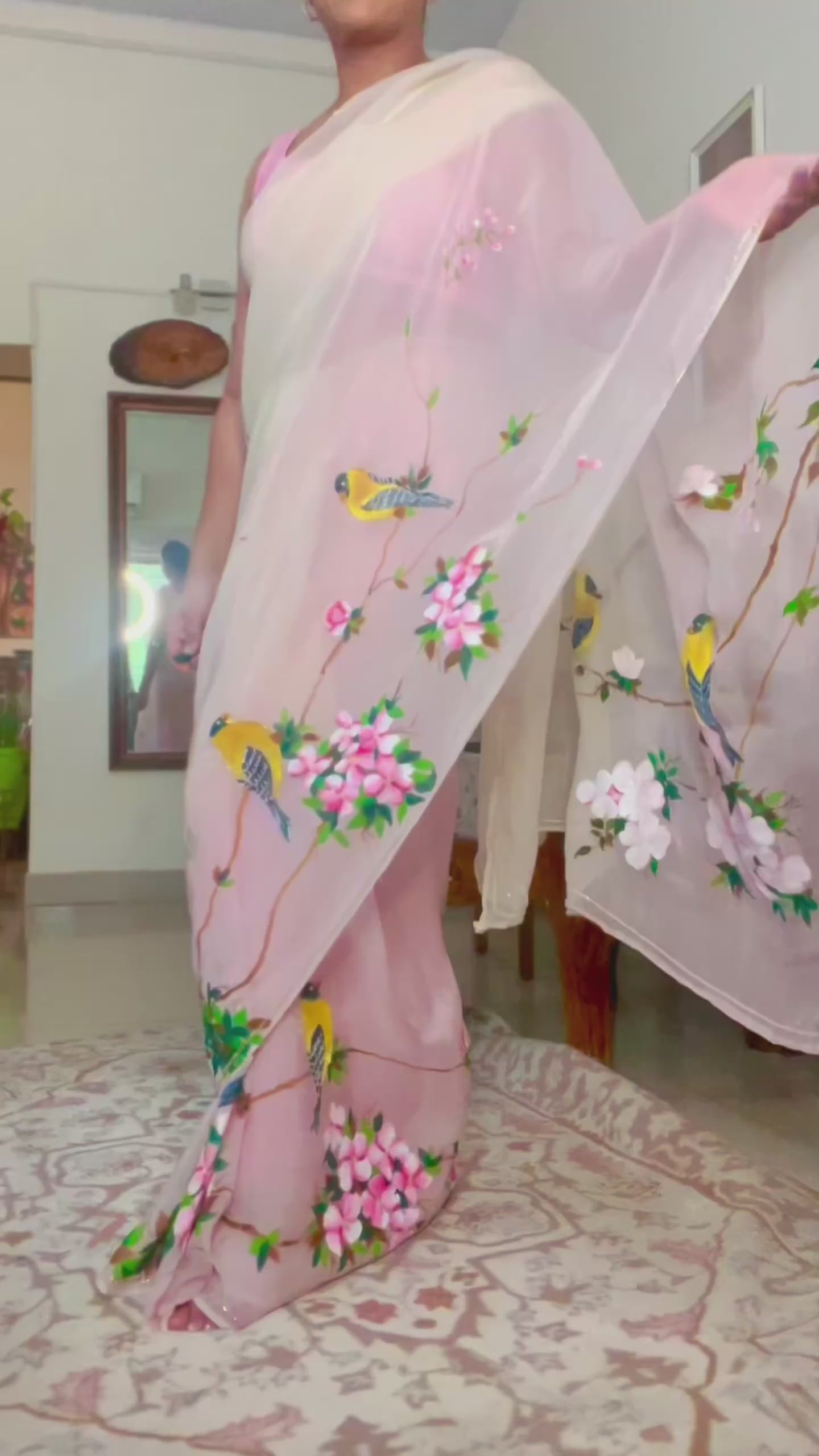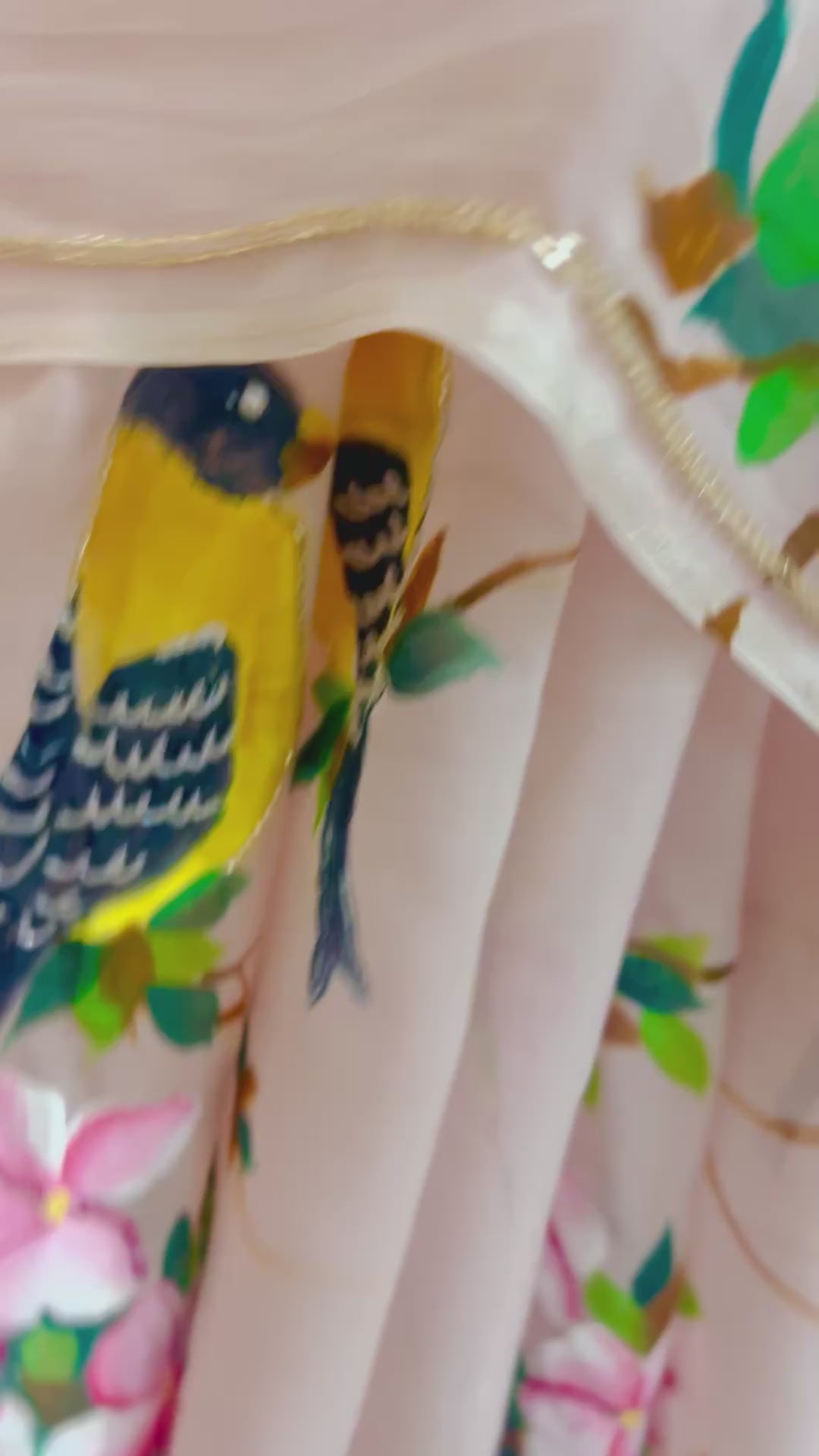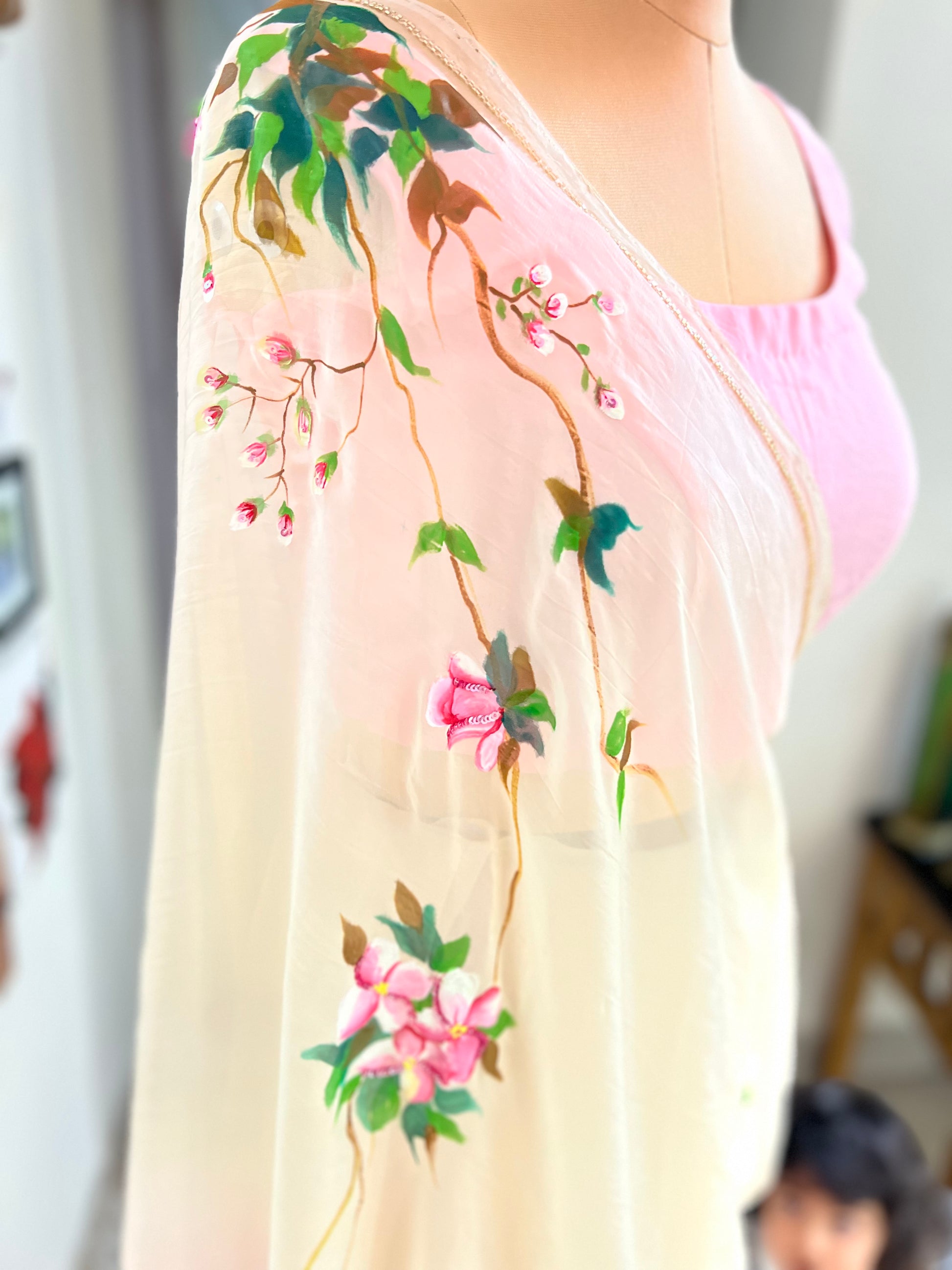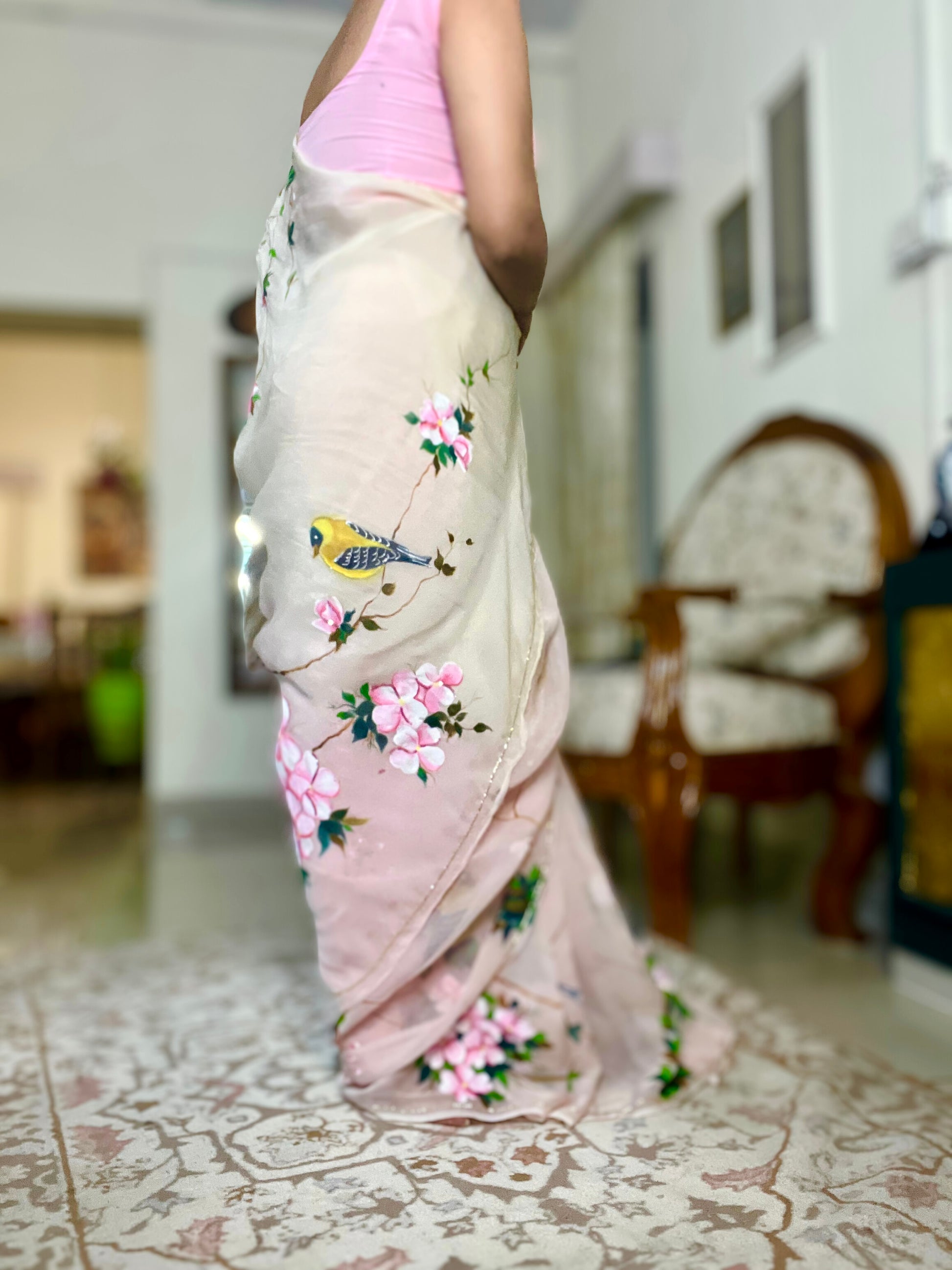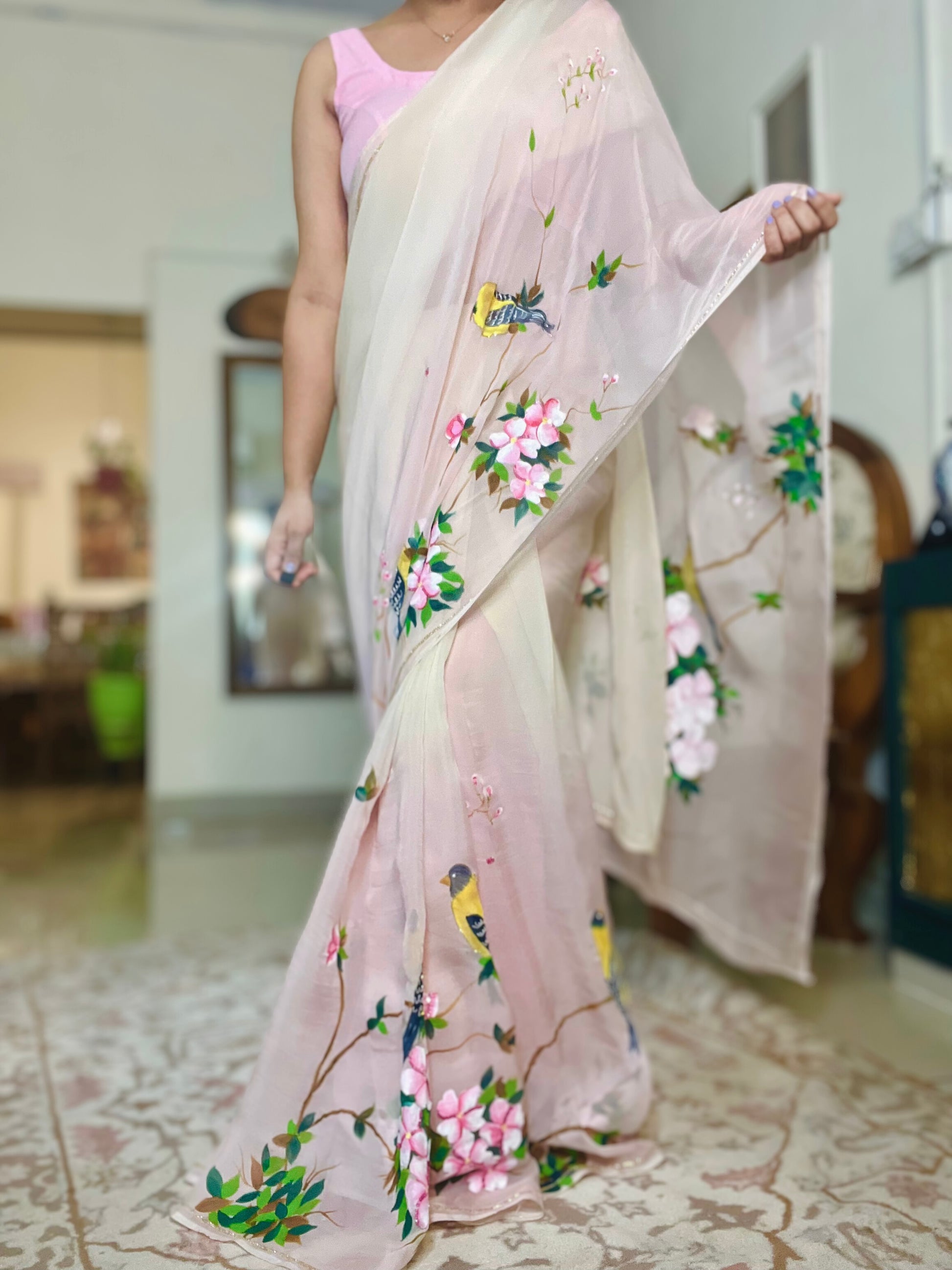 Each element is thoughtfully painted by hand, capturing the charm of garden moments — fluttering wings, fragrant blossoms, and quiet elegance. The sheer texture of organza silk adds an ethereal dimension, making this saree ideal for day weddings, intimate celebrations, or sundowner soirees.