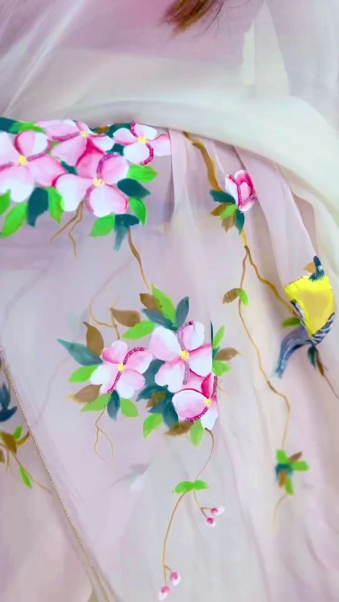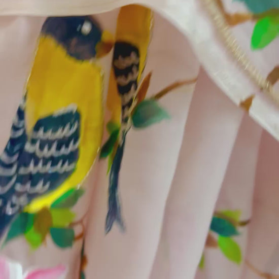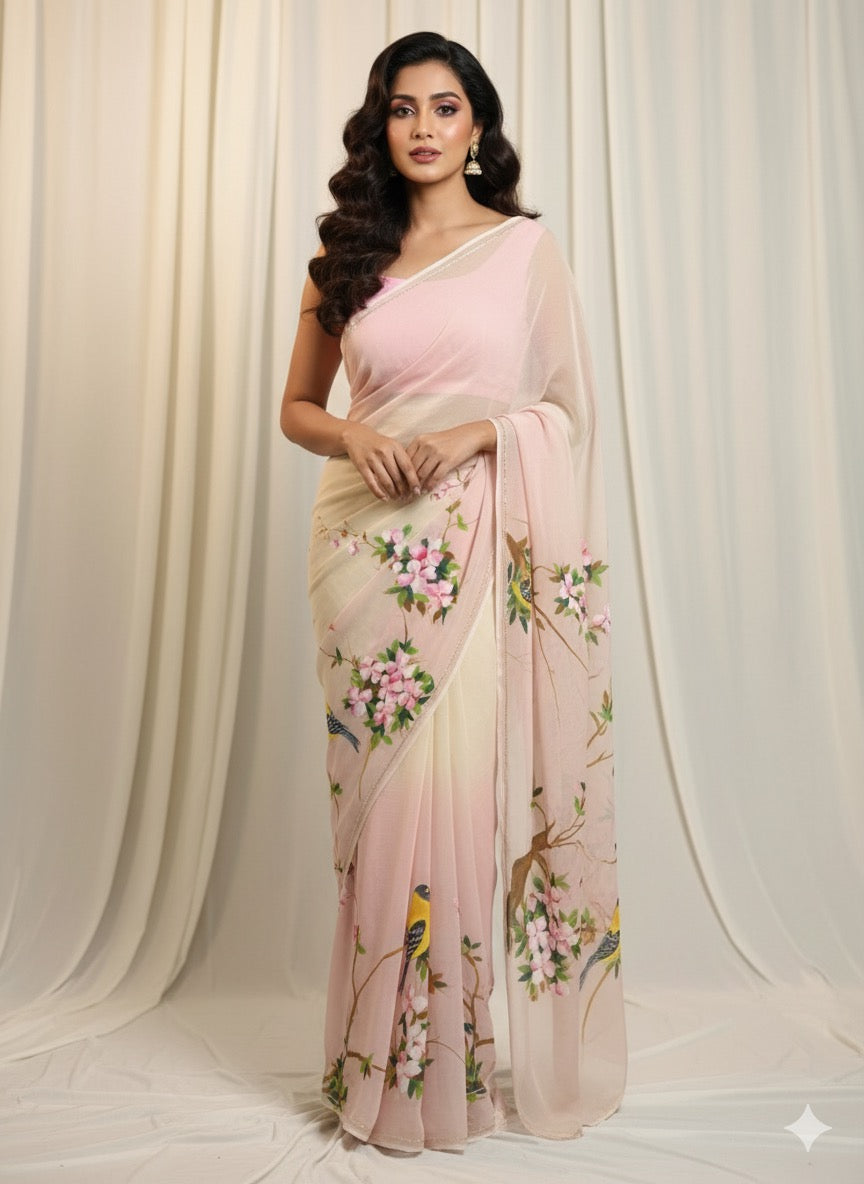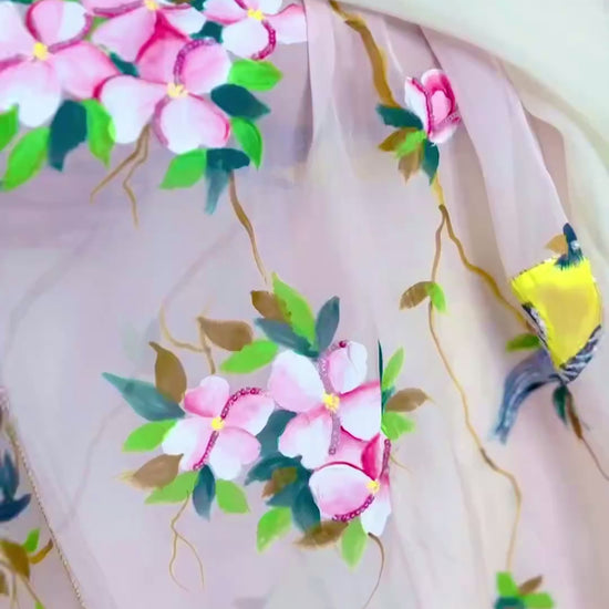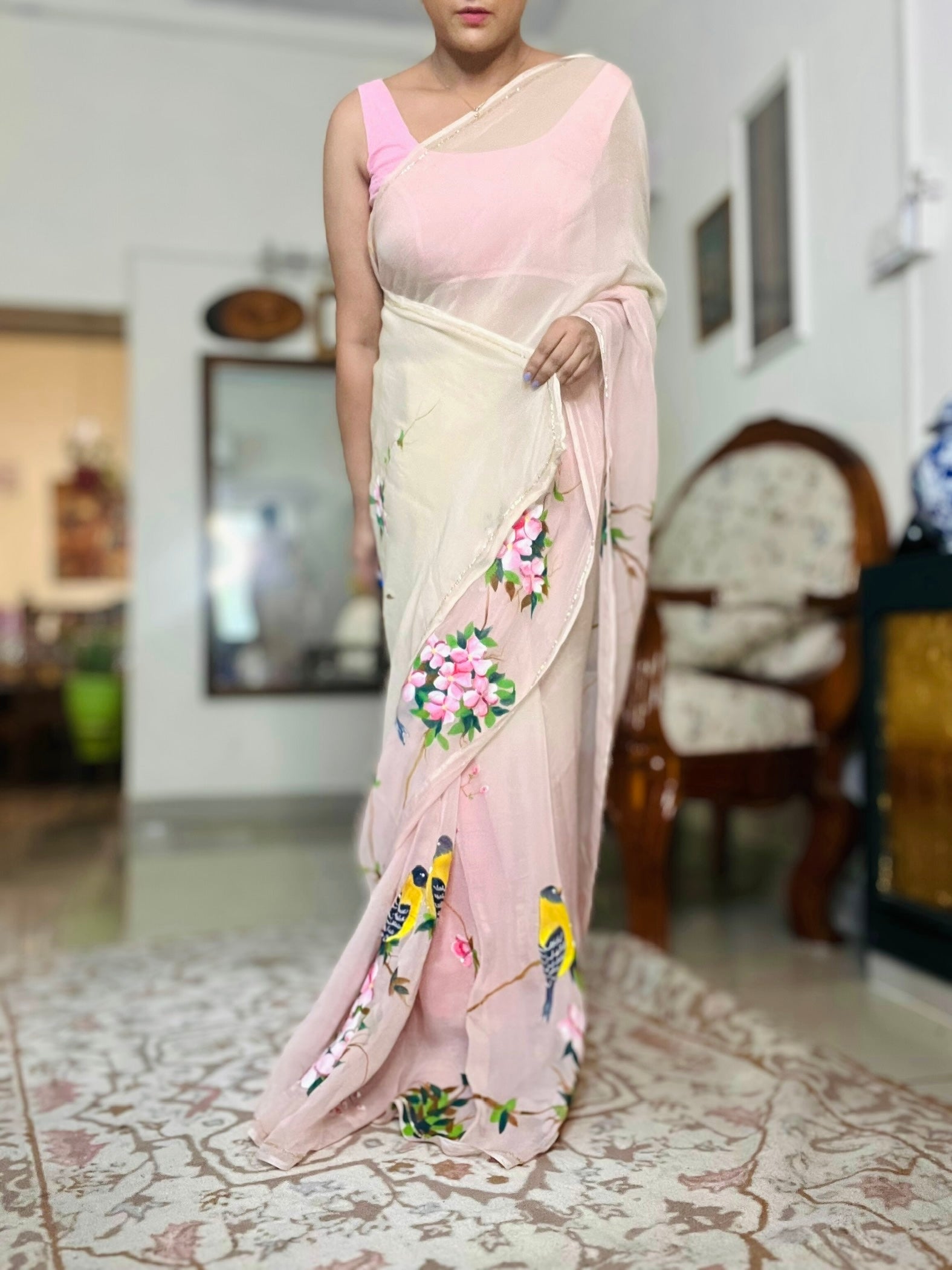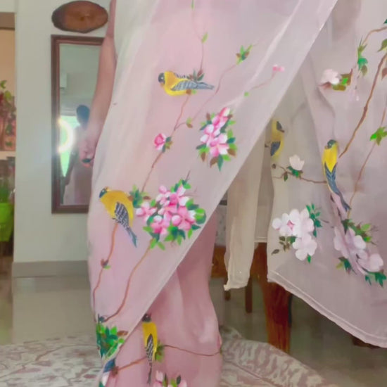 A gentle flight through nature’s poetry — this exquisite organza silk saree is hand-painted with blooming florals and dainty birds, set against a luminous double-shade canvas that shifts beautifully between hues as you move.