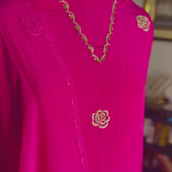 Embroidery: Intricately hand-embroidered using traditional techniques such as zardosi work on kurta, and sitara work highlighting floral patterns on the dupatta