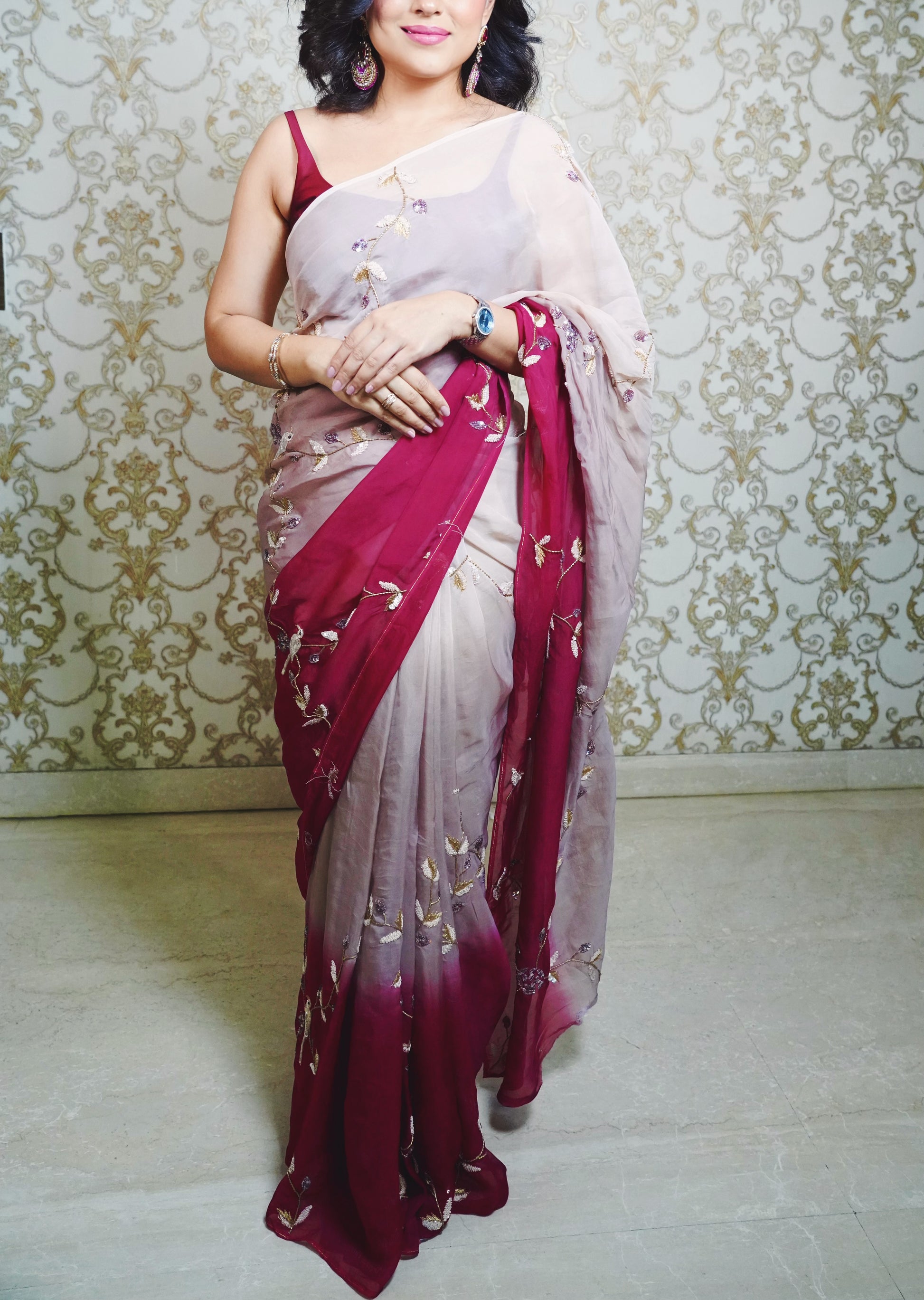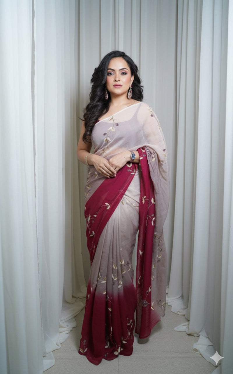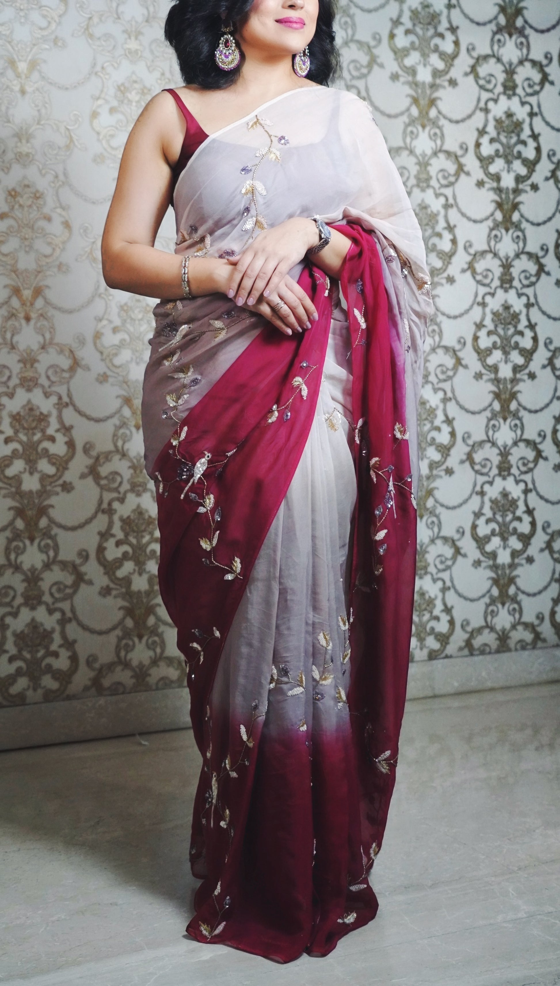 Step into a world where dusk meets artistry — this ethereal organza silk saree features a dreamy palette of three seamless shades, blending soft blush grey, deep maroon, and delicate in-between tones to evoke the mood of a twilight garden.