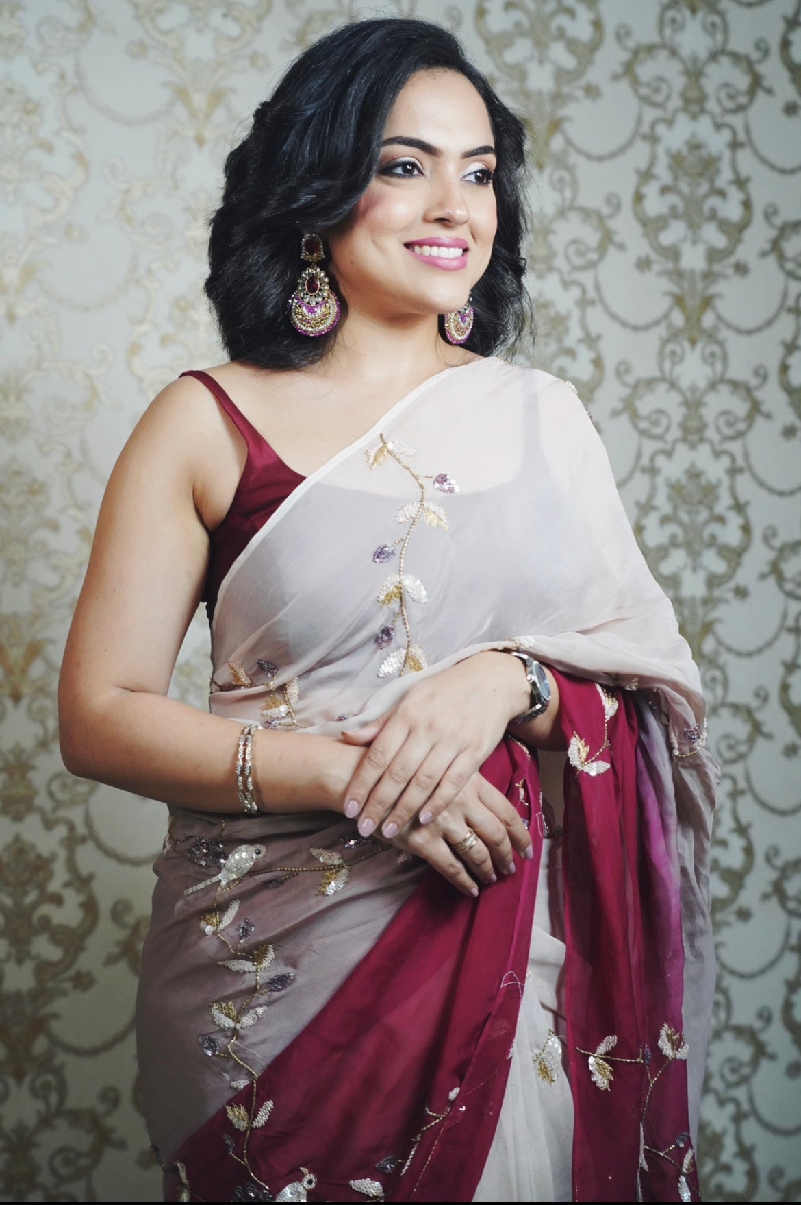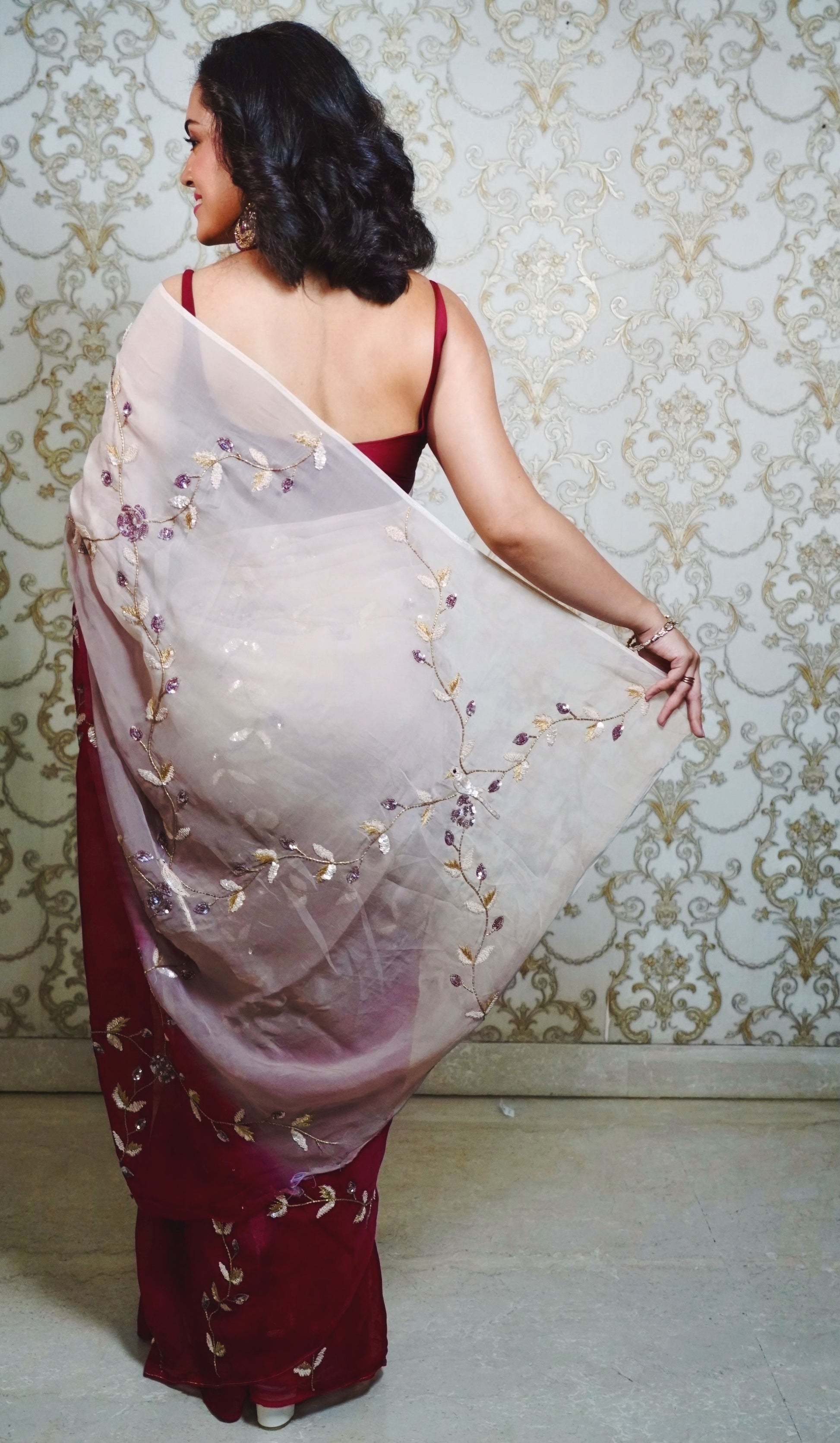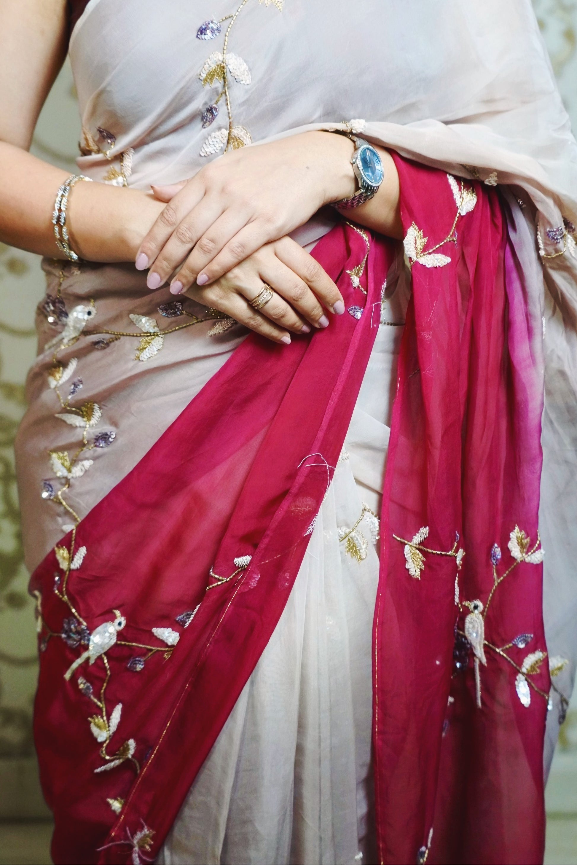 Step into a world where dusk meets artistry — this ethereal organza silk saree features a dreamy palette of three seamless shades, blending soft blush grey, deep maroon, and delicate in-between tones to evoke the mood of a twilight garden.
