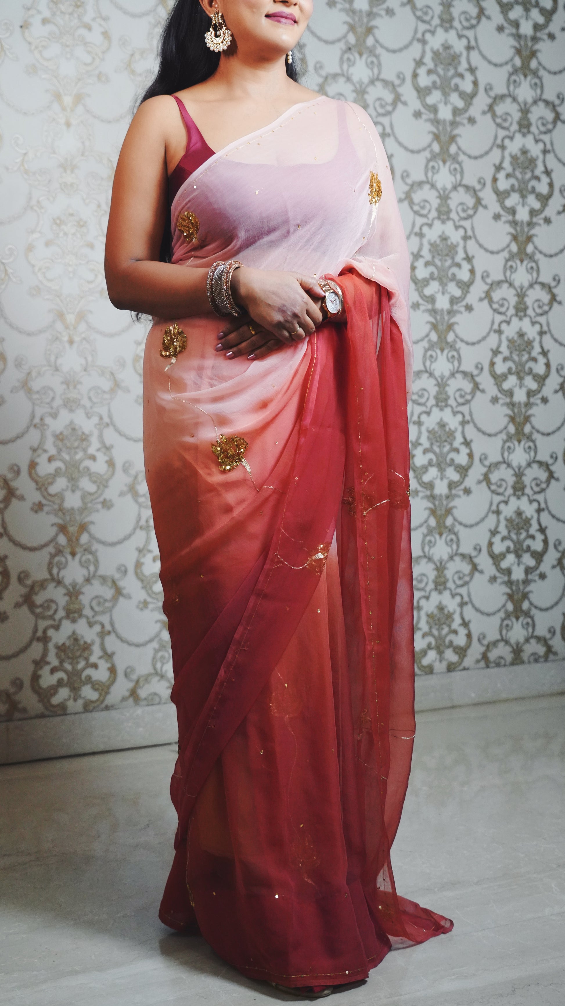 • Embroidery: Delicate sitara, aari, metallic beading hand embroidery