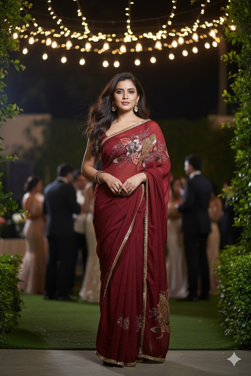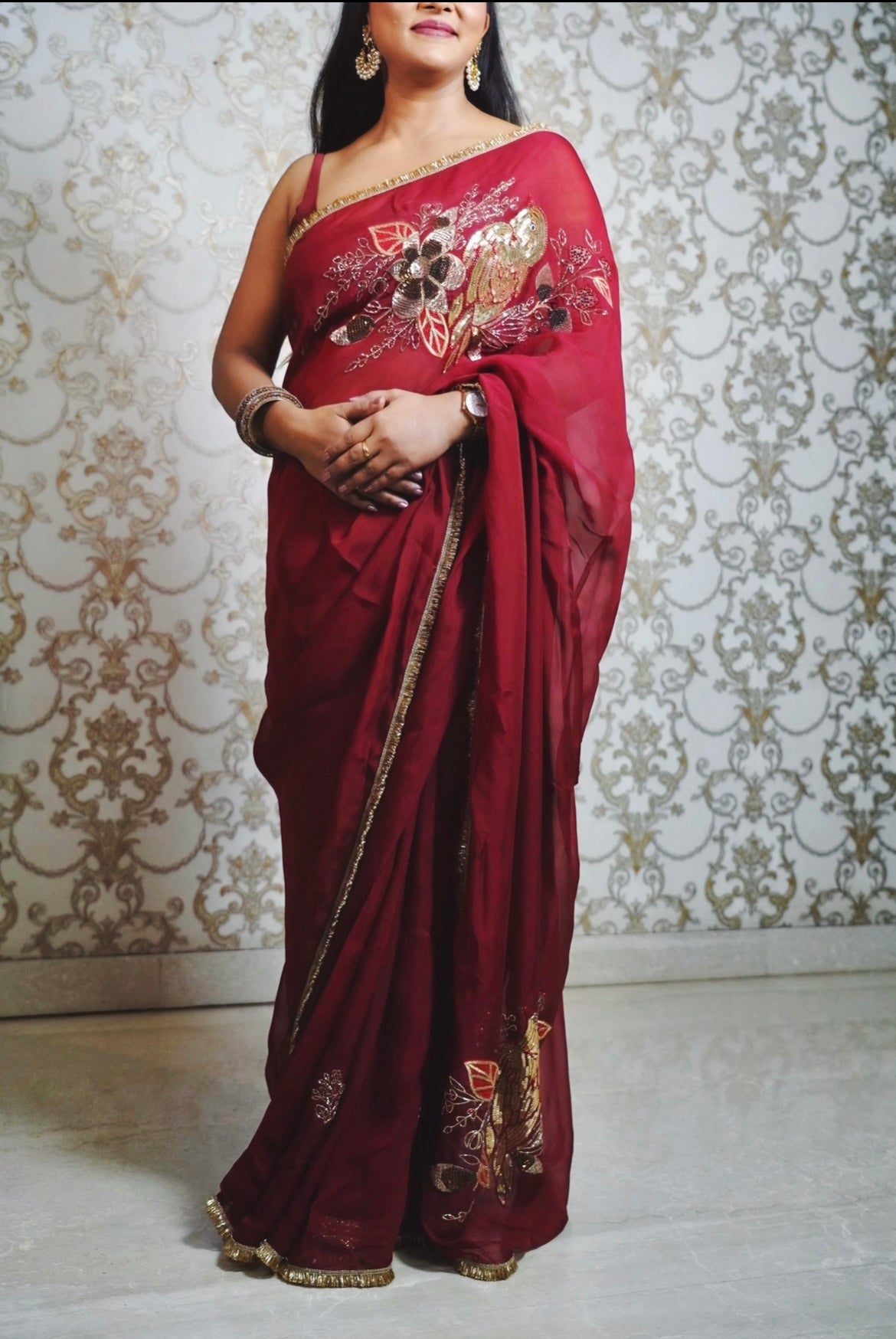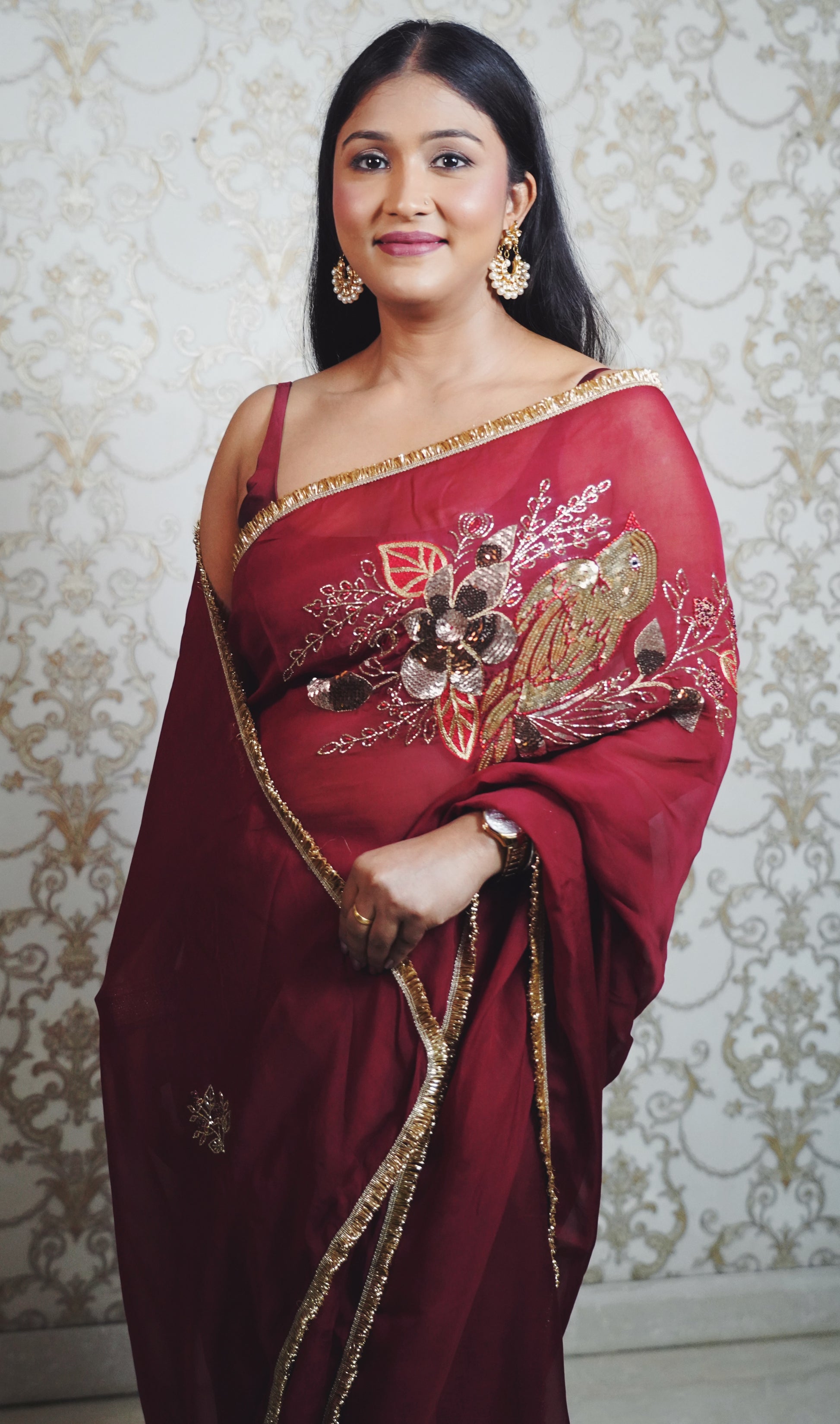 tapestry of elegance — this Maroon Hand-Embroidered Organza Silk Saree is adorned with delicate bird and floral motifs, thoughtfully placed across a silky, luxurious canvas.