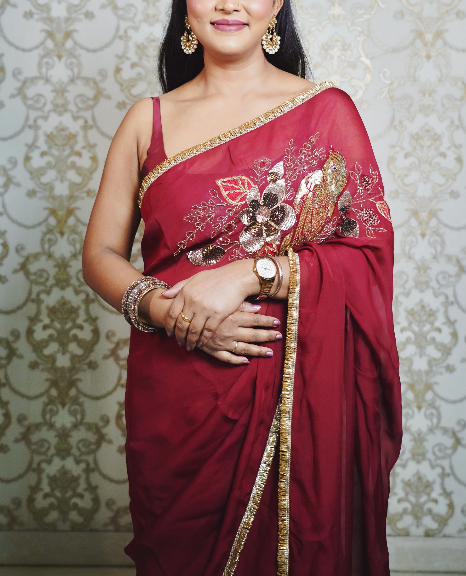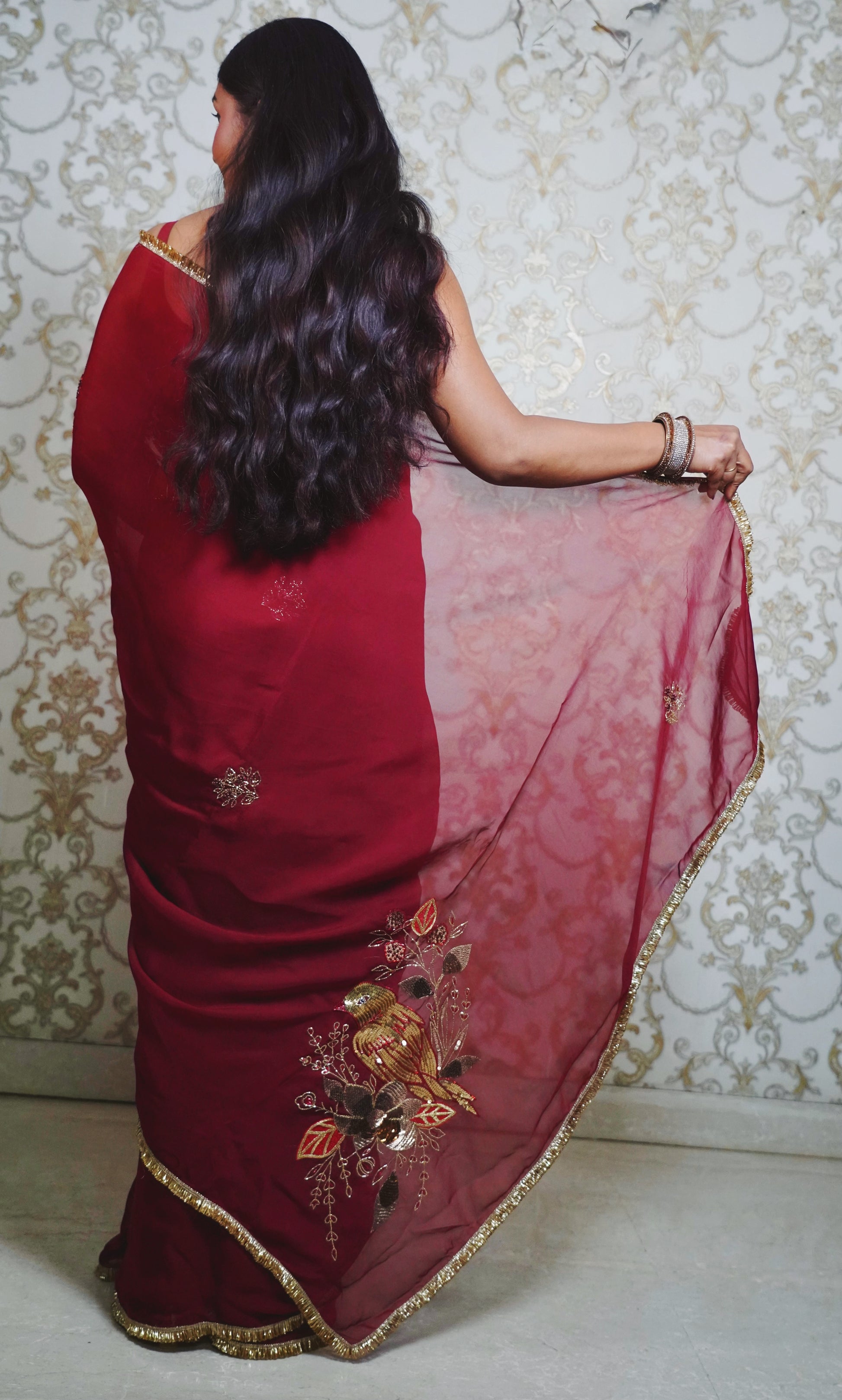 Signature Hand-Embroidered Birds & Blooms Saree in Maroon Organza Silk With Gota Border